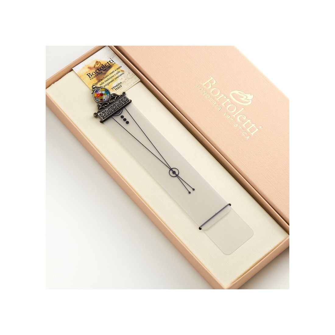 Håndlavet Murrina bogmærke med hvid bronze frise sat med en glas murrina. Den venetianske Millefiori murrina er afledt af de forskellige geometriske og blomstermotiver, der er fortryllende udformede små glasstænger, der stadig er et mysterium for mange mennesker på grund af deres udsøgte dekoration.
