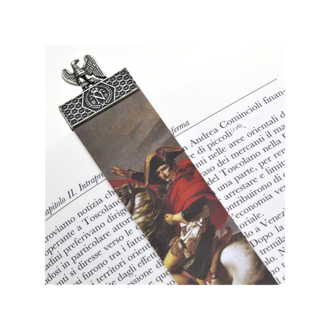 Et originalt bogmærke med en frise, der forestiller Napoleons emblem, indgraveret med bier, et symbol på udødelighed. Bier blev opdaget i 1653 i Tournai i graven af Childerico I, grundlæggeren i 457 af det merovingerske dynasti.