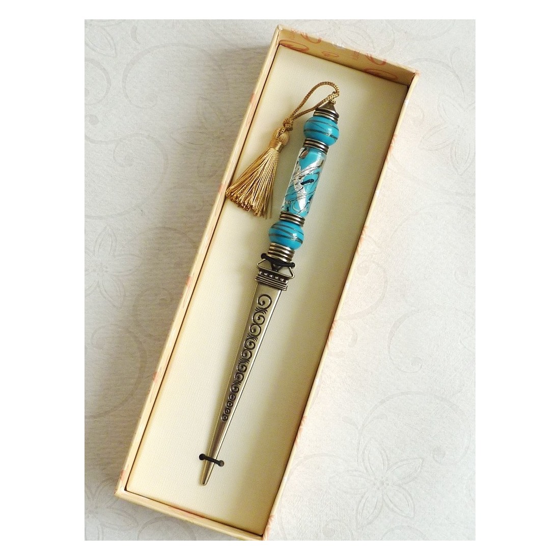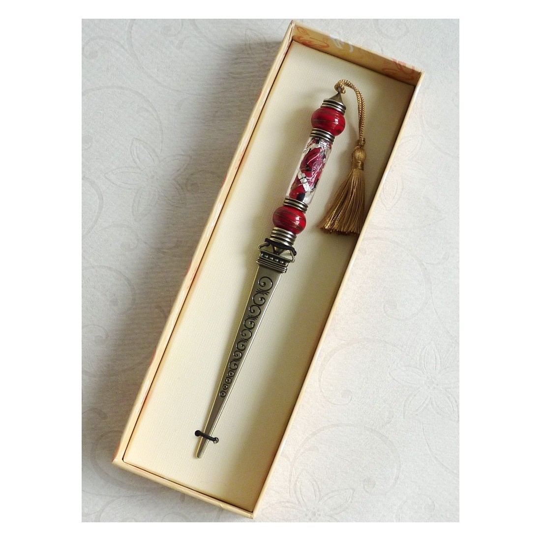 Brevåbner af glas og nikkel-sølv. En udsøgt venetiansk stil, der er blevet omdefineret. Dette vil gøre en elegant gave og se vidunderlig ud på dit skrivebord. Håndlavet med Murano-glas. Fås i forskellige farver.