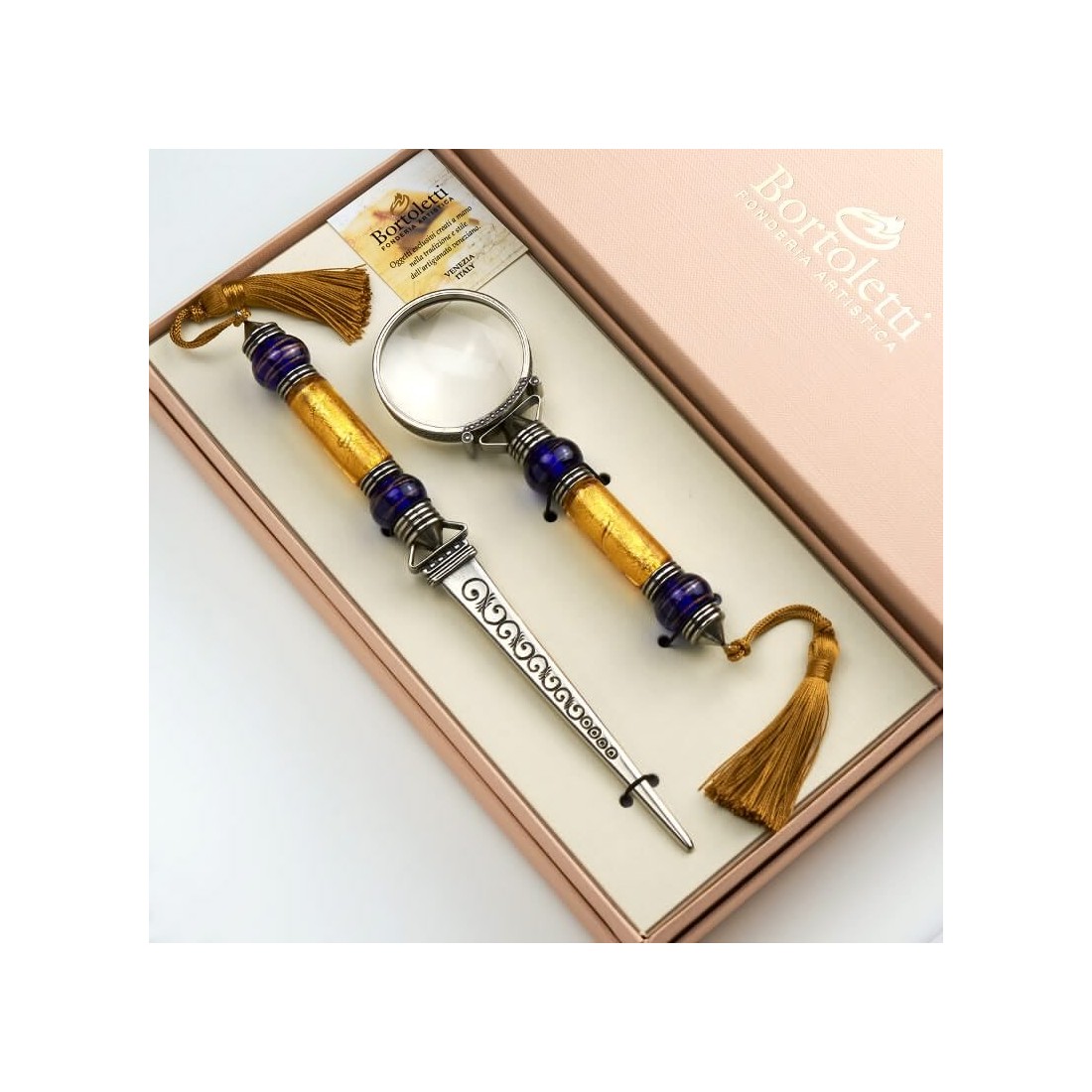 Kærlighed til detaljer og raffinement fra håndlavet bladguld til dit skrivebord. Guld skrivebordstilbehør med Murano-glasperler pyntet med bladguld smeltet sammen i glas med håndforarbejdede hvide bronzedetaljer. En mulighed for at afsløre din gode smag. Dette sæt, der består af en brevåbner og linse, er enestående, resultatet af Bortoletti og hans mesterjuvelerers igangværende forskning i design.