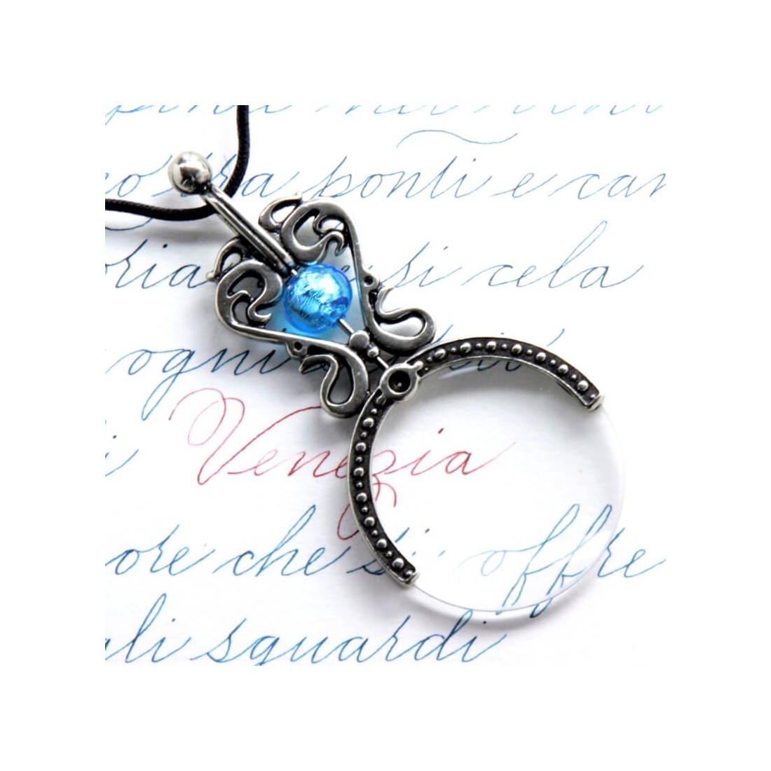 Dette stykke smykke er velegnet som en original gave. Lavet af hvid bronze med påføring af en murano glasperle med sølv eller guldblad fusioneret ind i glasset. Ranieri nakke forstørrelsesglas er et originalt design af Bortoletti.