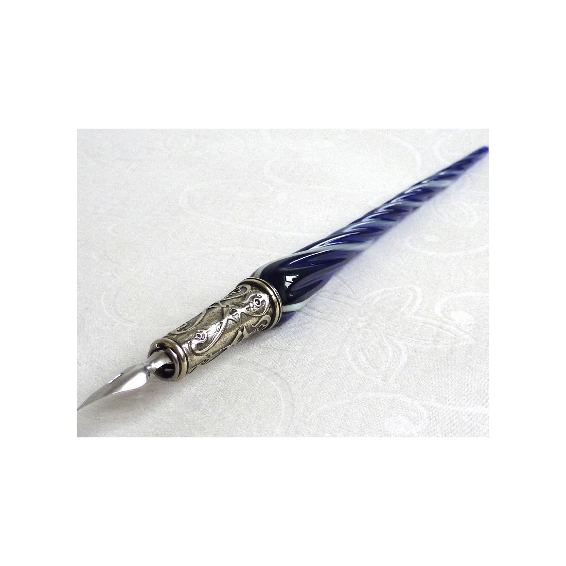 En venetiansk snoet glas pen. Smukt udformet, hånd færdig, kalligrafi pen sat for dem, der elsker den stil og elegance i Venedig. Omfatter en snoet glas aksel med en nikkel sølv pen, tre spidser og en flaske blæk. Fås i en række farver. Fremstillet i Italien af Bortoletti Fonderia Artistica.