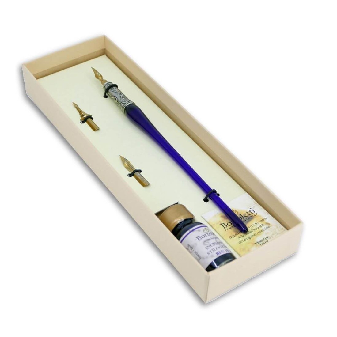 En almindelig glas kalligrafipen, lavet af Murano-glas og forniklet sølvfarvet bronze. Komplet med to ekstra spidser og en 10 ml flaske vandbaseret blæk. Vælg mellem ni vidunderlige glasfarver.