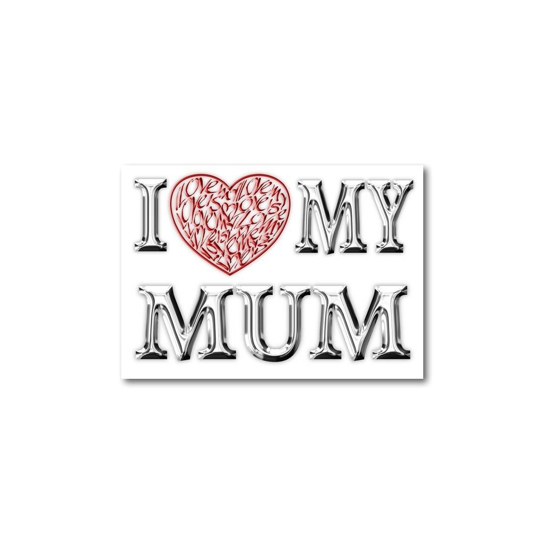 En dejlig mors dag kort med krom effekt bogstaver omgiver et rødt kalligrafisk hjerte. Fås i to størrelser. Blank indvendig til din egen personlige meddelelse.