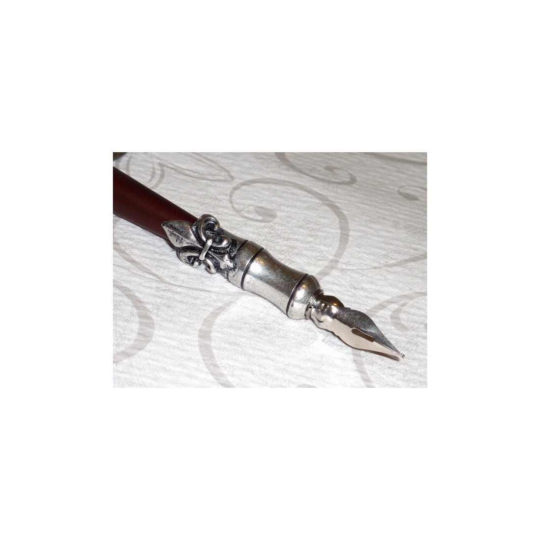 En tin kalligrafi pen med en træaksel. Tinholderholderen har et fleur de lys design, der er meget stilfuldt. Leveres komplet med en flaske sort blæk. Spidserne kan let skiftes. Lavet i Italien af La Kaligrafica.