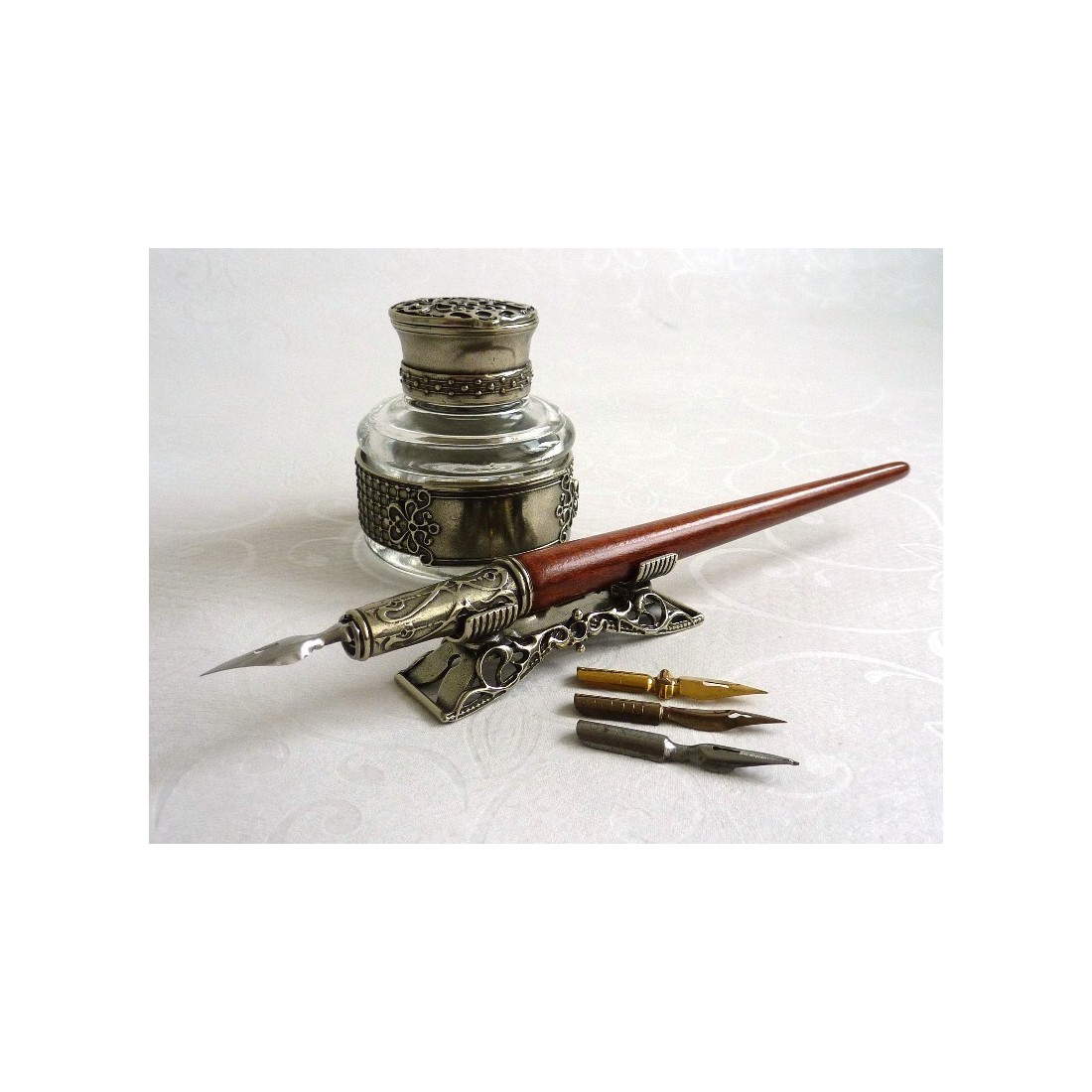 Træ kalligrafipenn sæt med blækhus og udsmykkede pennestøtter. Stor værdi og raffinement. Sættet består af en træpen med bronzespidsholder belagt i nikkel sølv, blækhus og fire antikke spidser. Et komplet sæt til at øve kunsten at smukke skrivning. Blækhullet kan også graveres med et navn eller en speciel besked. Ideel som en gave.