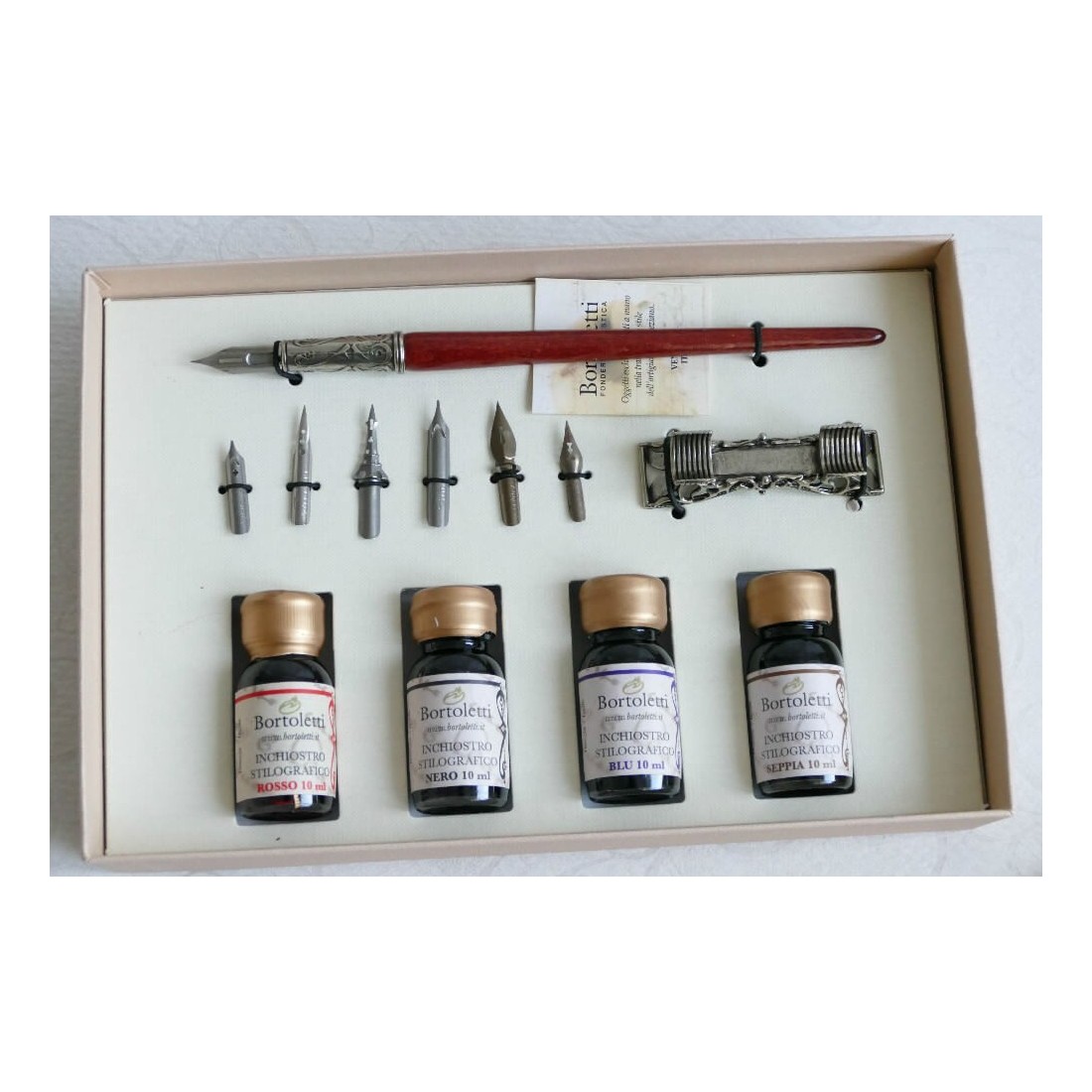 Stor værdi og raffinement. Set komponeret af træ pen, bronze pen supporter, fire flasker af blæk og seks antikke spidser.
