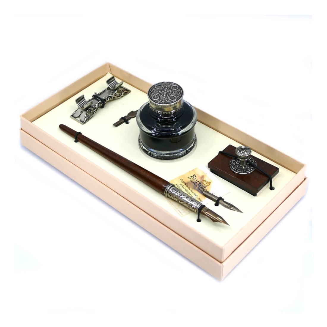 Stor værdi! Et fantastisk skrivningssæt bestående af en træ kalligrafi dip pen, 40ml glas inkwell med sort blæk, bronze pen holder, blotter og tre antikke nibs.