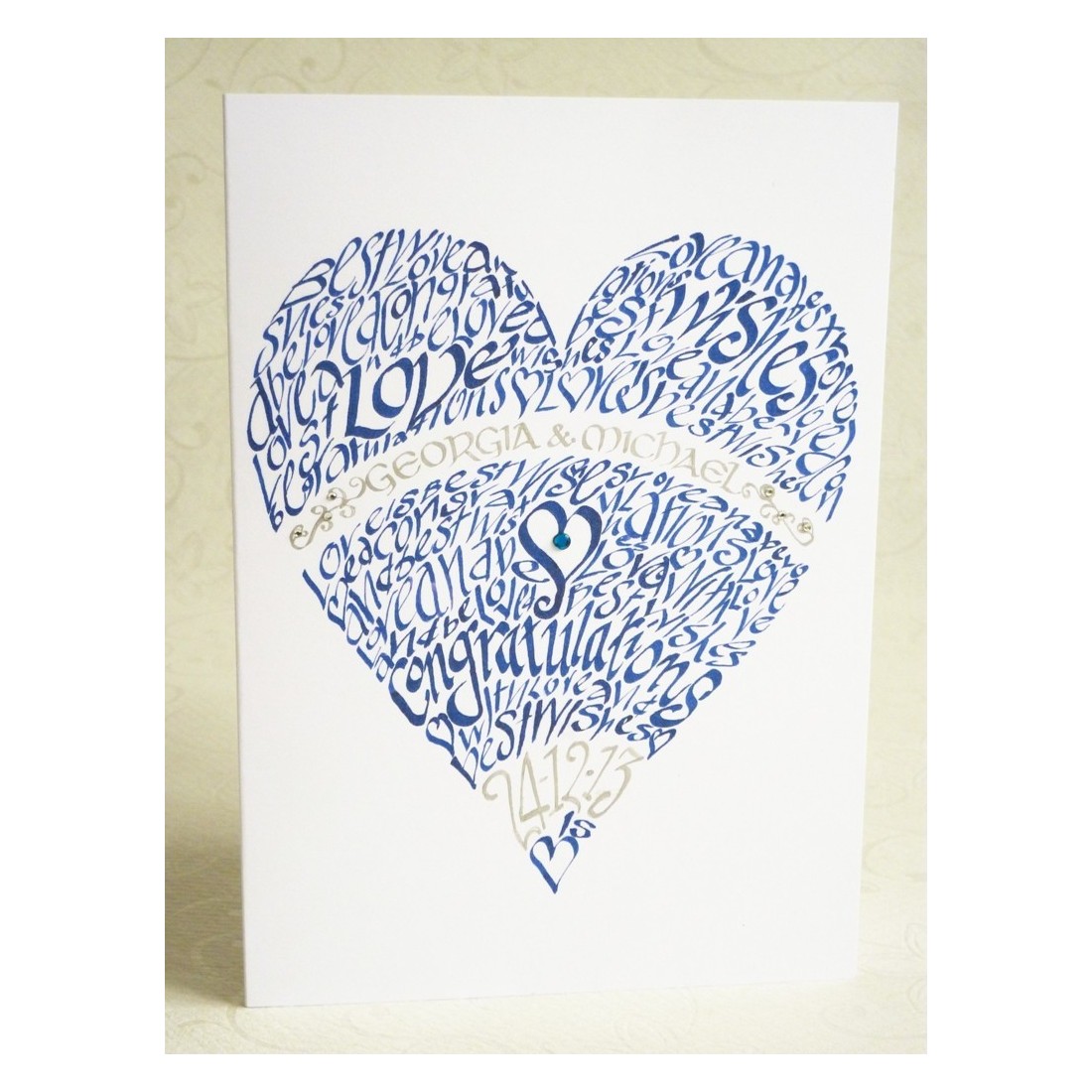 En smuk, personlige kort, der er tilgængelige i forskellige farver. Fantastisk til Valentins dag, eller et engagement eller endda et bryllup. Sende din kærlighed med dette specielt oprettet kort. Brug fanen Tilpasning til at angive dine farver, tilføje dine navne og endda en særlig dato.