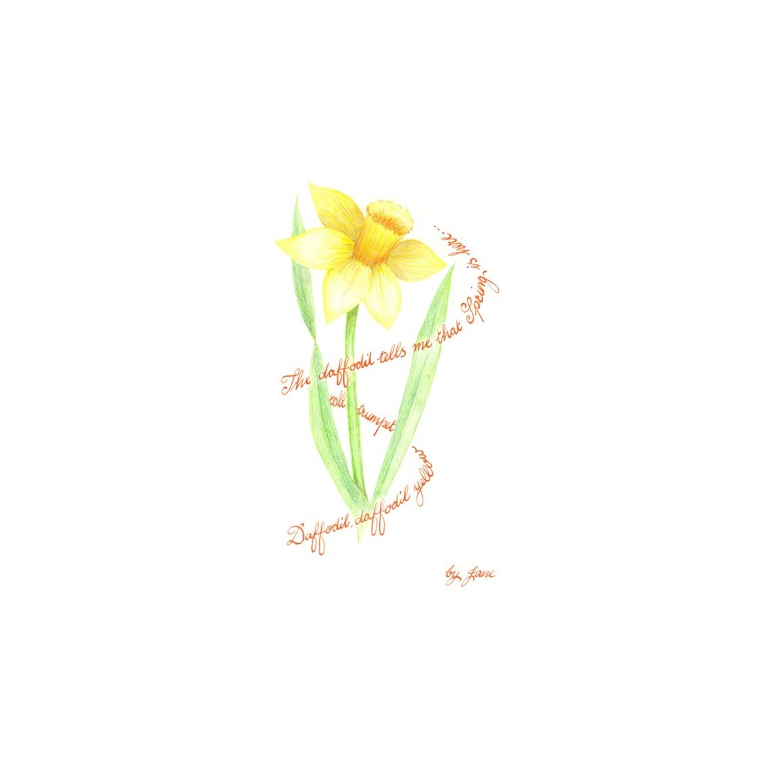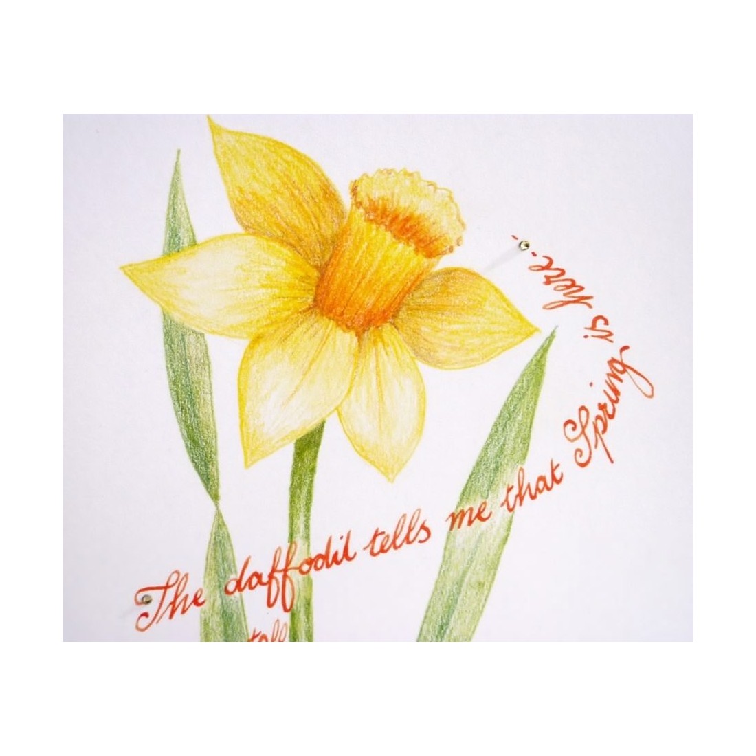 Frühlingsnarzisse. Kalligraphie-Grußkarte. Eine wundervolle Narzissenkartenhand, gezeichnet mit Bleistiften von Jane mit einem saisonalen Frühlingsreim, der in Kalligraphie um die Blume geschrieben wird.