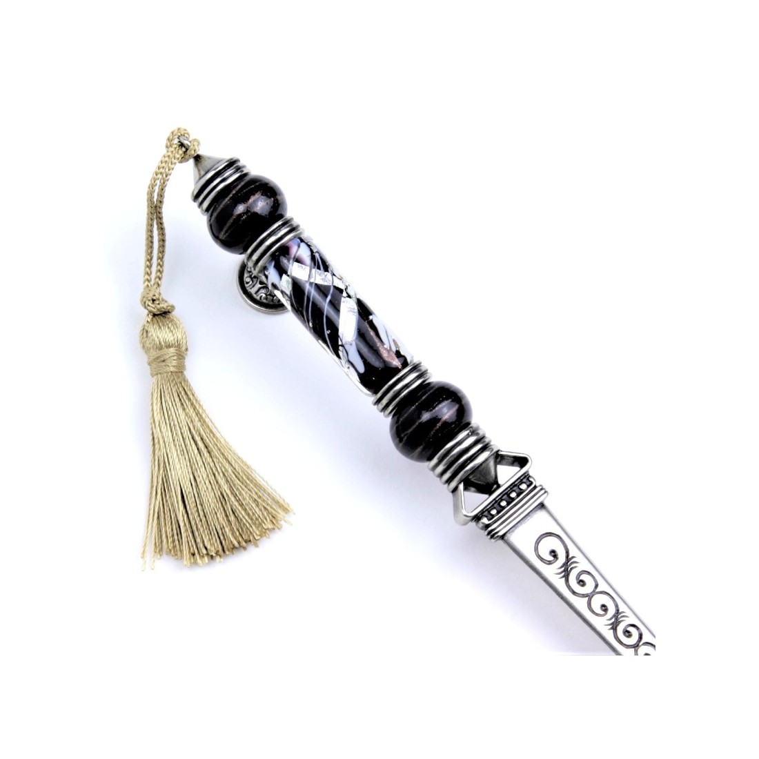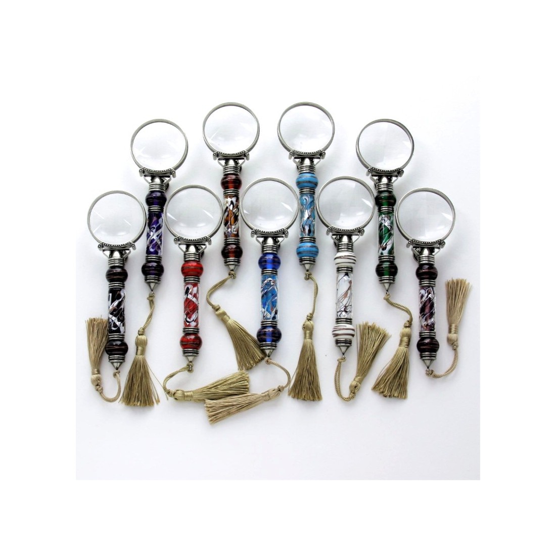 Brieföffner und Lupe. Nützliche Gegenstände und dekorative Elemente, die auf Ihrem Schreibtisch großartig aussehen. Sie bestehen aus Neusilber mit Muranoglas, das Blattsilber enthält. Komplett mit goldgeflochtenen Quasten. Das altmodische Design und die Pflege dieser Artikel sprechen für sich.