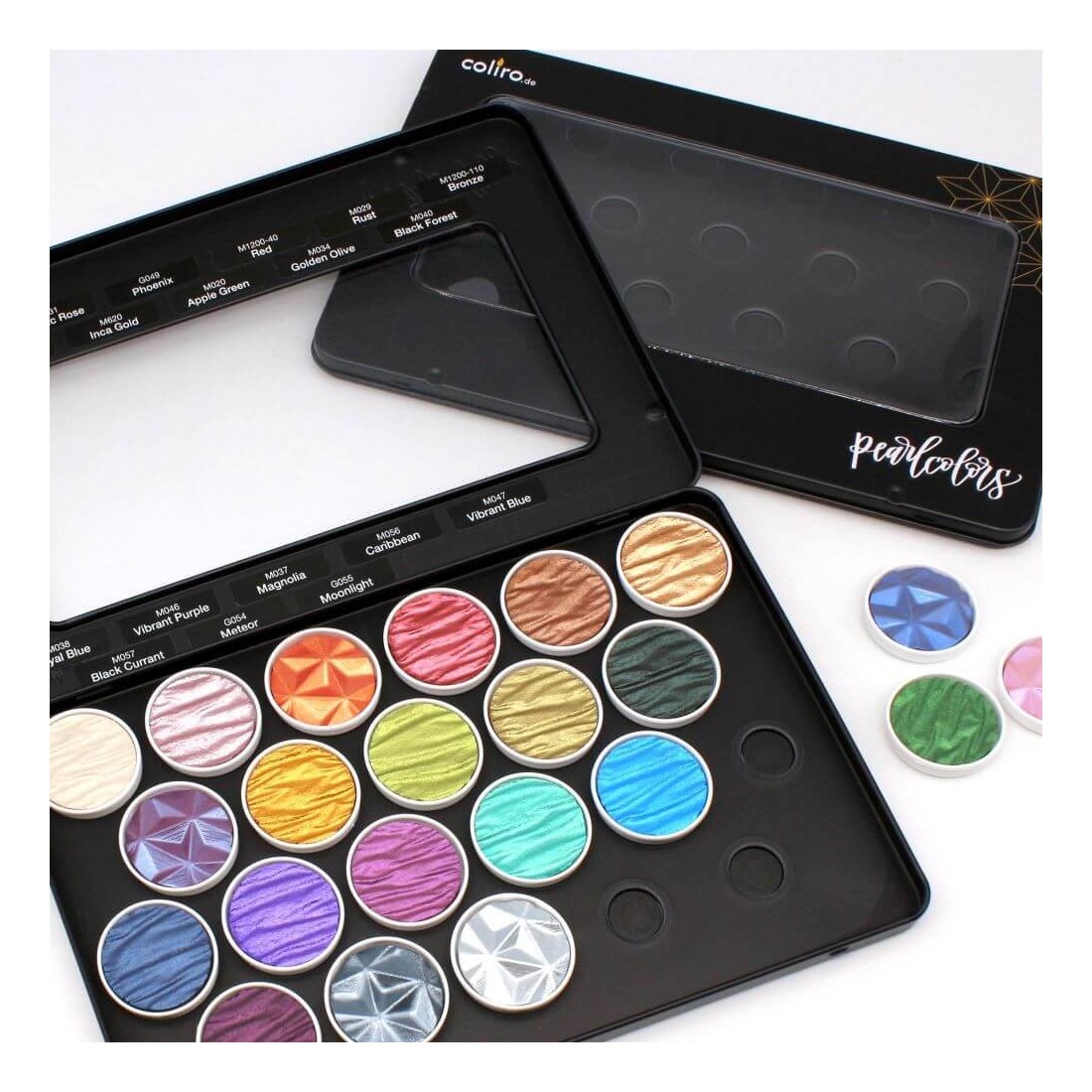 Geräumige schwarze Metallpalette für 22 Coliro Pearlcolors. Mit einem klaren Deckel und Raum für Namensaufkleber, perfekt für die Organisation größerer Sammlungen.