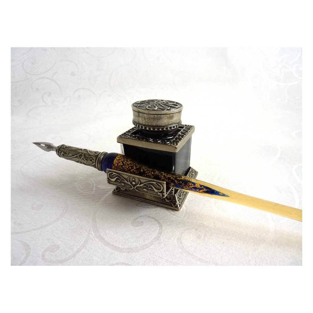 Eine schön gestaltete, handgefertigt, Kalligraphie Dip-Pen mit Murano-Glas und Blattgold gesetzt. Eine Glas & Nickel versilbert, bronze Dip-Pen, vier Schreibfedern und eine verzierte Tintenfass. Erhältlich in einer Reihe von wunderbaren Farben.
