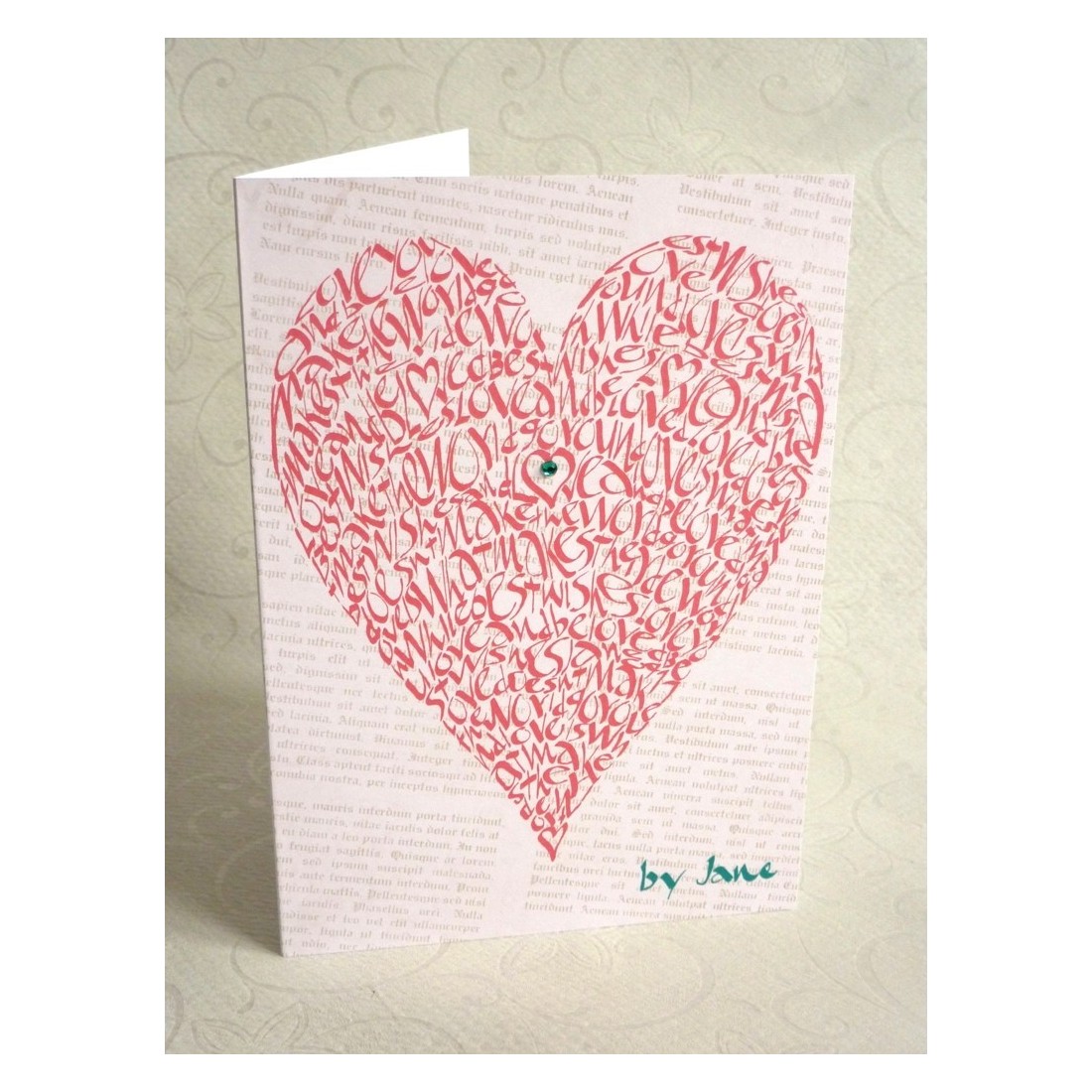 Wunderbar für den Valentinstag, sondern auch ein weiterer Weg, um Ihre Gefühle für Ihre Liebsten zu zeigen, zu jeder Zeit des Jahres. Eine schöne, einzigartige und handgemachte Grußkarte in Form einer Valentinsgruß-Herz. Entworfen mit Kalligraphie mit Worten und Phrasen, die Liebe und Glück zu feiern. Dieser wunderschöne, handgemachte Karte hat diamantes platziert auf beiden Seiten der Text am unteren Rand der Karte und auch in der Mitte der Karte.