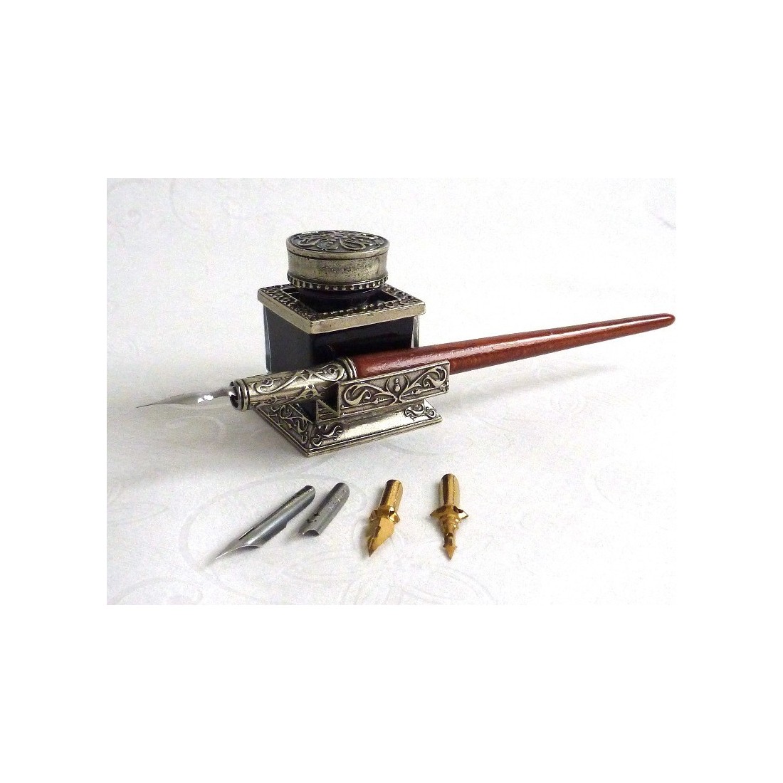Hölzerner Kalligraphie-Feder-Satz mit Tintenfass und Federrest. Tolles Preis-Leistungs-Verhältnis und Raffinesse. Set besteht aus einem Holzstift mit Bronzefederhalter aus Nickelsilber, Tintenfass und vier antiken Federn.