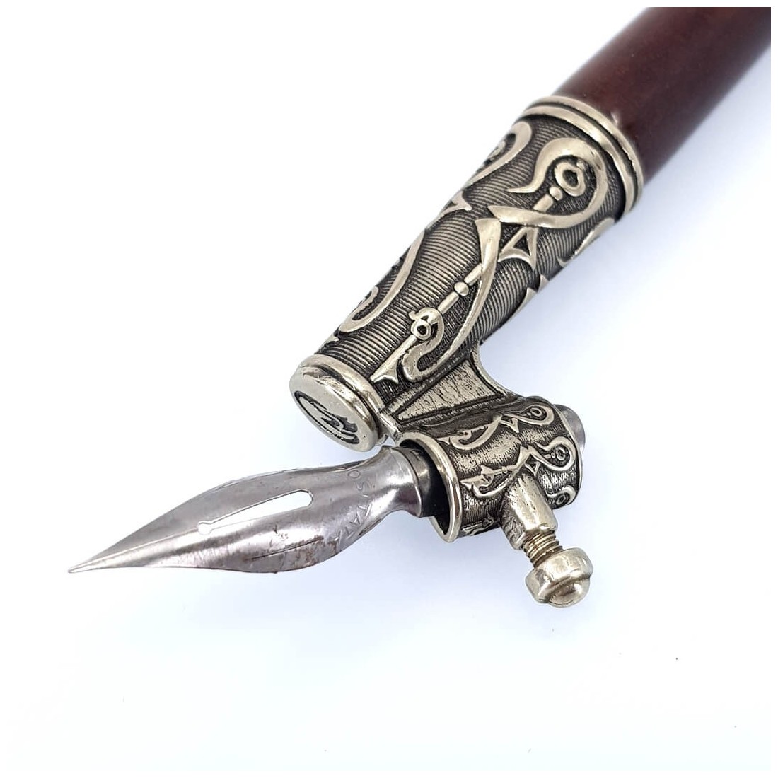 Der abgewinkelte Bronze-Flansch positioniert die NIB an der richtigen Neigung, wodurch es leichter ist, glatte Haarlinien und kontrollierte schattige Schläge zu erreichen. Egal, ob Sie grundlegende Bohrer praktizieren oder fertige Teile erstellen, dieser schräge Kalligraphiestift unterstützt Präzision und Komfort.