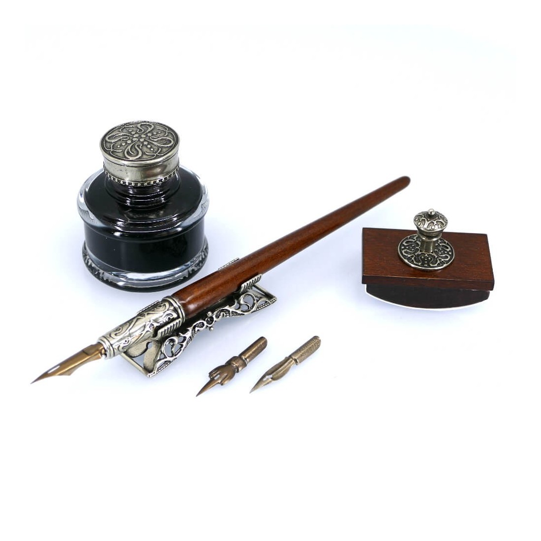 Tolles Wert! Ein tolles Schreibsatz, der einen hölzernen Kalligraphie-Dip-Stift, 40 ml-Glas-Tintenblatt mit schwarzen Tinte, Bronze-Stifthalter, Blotter und drei antiken Nibs umfasst.