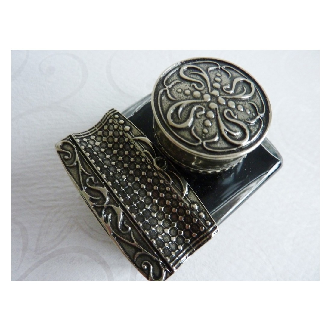 Ein schönes Design in Bronze und Neusilber - sehr elegant und traditionell. Die dreieckige Design auf der Vorderseite vermittelt Eleganz und Charakter. Für das Büro oder für zu Hause, in der klassischen und modernen endlich treffen. Das Tintenfass hat Friese aus Alpaka. Ein ideales Produkt für diejenigen, die wollen immer noch Qualität - für diejenigen, die wollen immer noch Tradition.