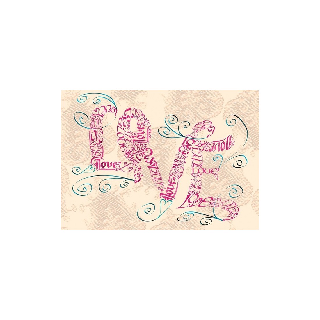 Eine klassische Version unserer anderen echten Kalligraphiekarte. Elegante rote Schrift bildet das Wort "Love", umgeben von fließenden Wirbeln, Kreisen und Diamanten.