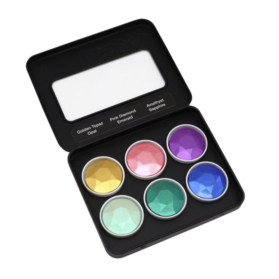 Diese Metallbox enthält fünf deckende Farbtöne „Golden Topaz“, „Pink Diamond“, „Amethyst“, „Emerald“ und „Sapphire“ sowie die transluzente Farbe „Opal“ – diese wirkt leuchtend auf schwarzem Papier und schimmernd auf weißem Papier