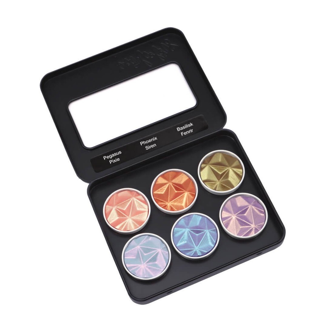 Metallkoffer mit den Pearlcolors „Pegasus“, „Phoenix“, „Basilisk“, „Pixie“, „Siren“ und „Fenrir“. Diese Pearlcolors erscheinen je nach Lichteinfall und Farbe des Papiers in unterschiedlichen Farbtönen.