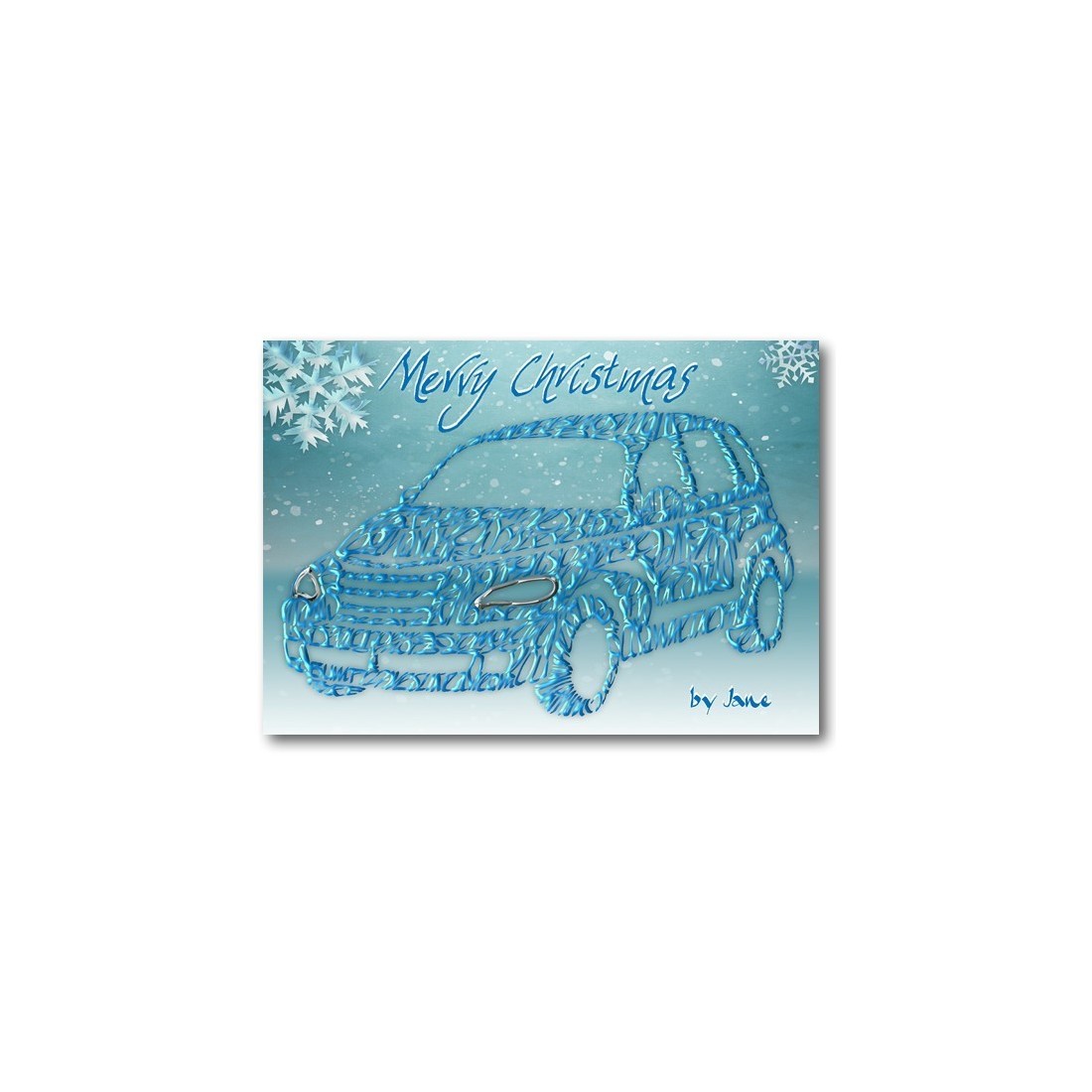 A Christmas Chrysler PT Cruiser with words and phrases about the car and the PT Cruiser name. These come in blue or purple on fantastic snowy backgrounds. Chrome effect around the headlamp.