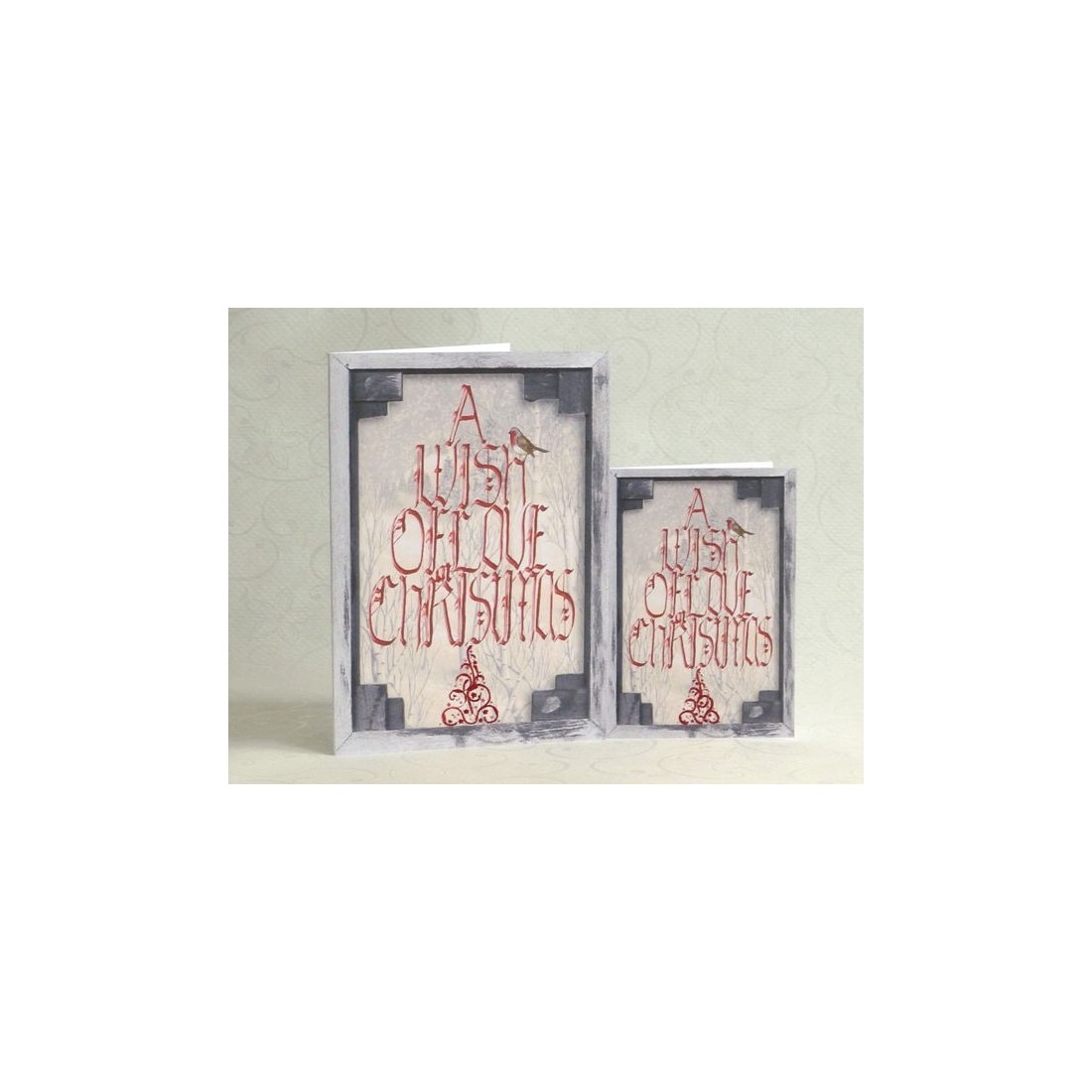 A Wish of Love at Christmas. Wonderful sentiments for that wonderful time of year. Red Gothic style calligraphy laid out as a tree on a winter wonderland background.