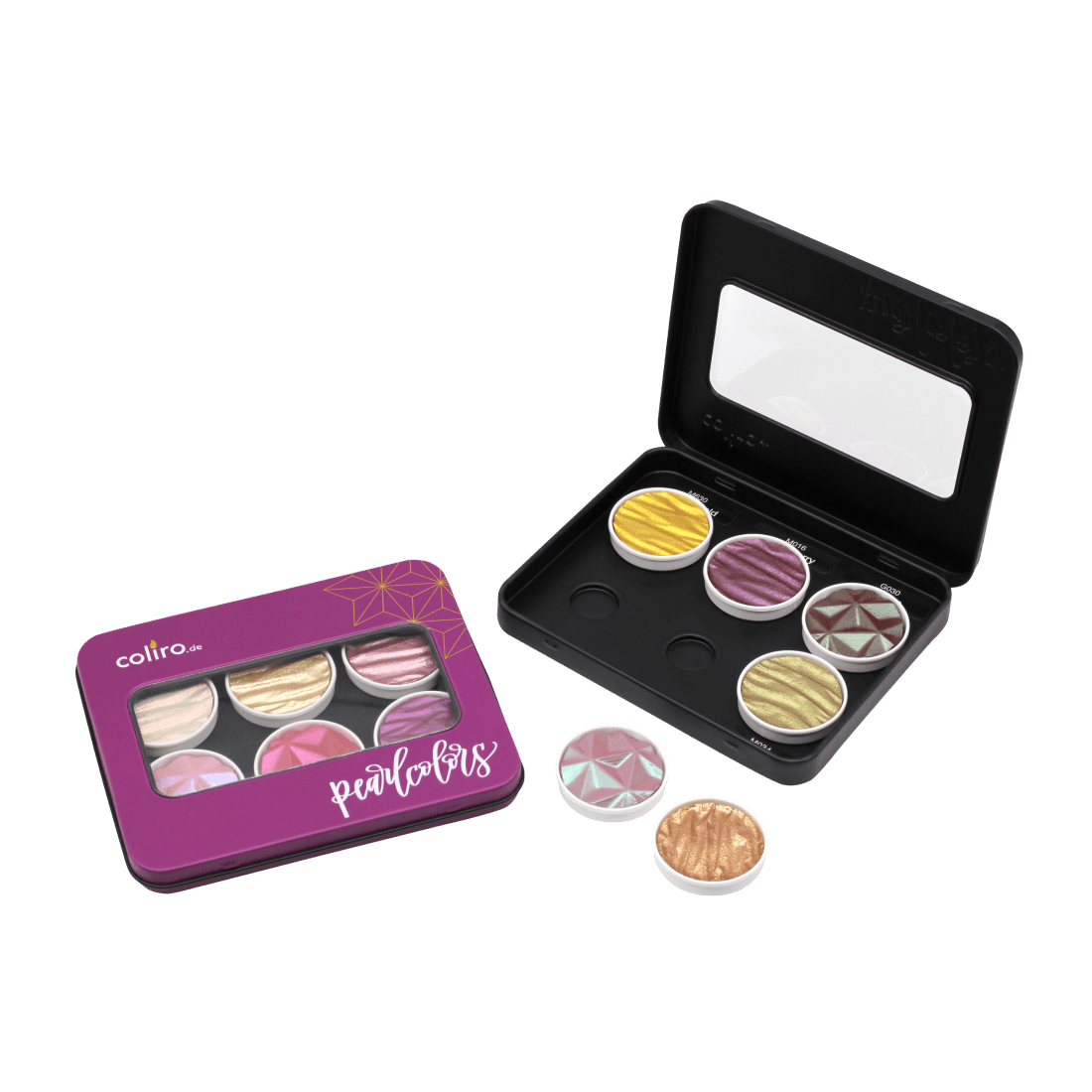 Compact and stylish purple Coliro palette box for 6 Pearlcolors. Features a clear lid to view colours and a dedicated space for name stickers.