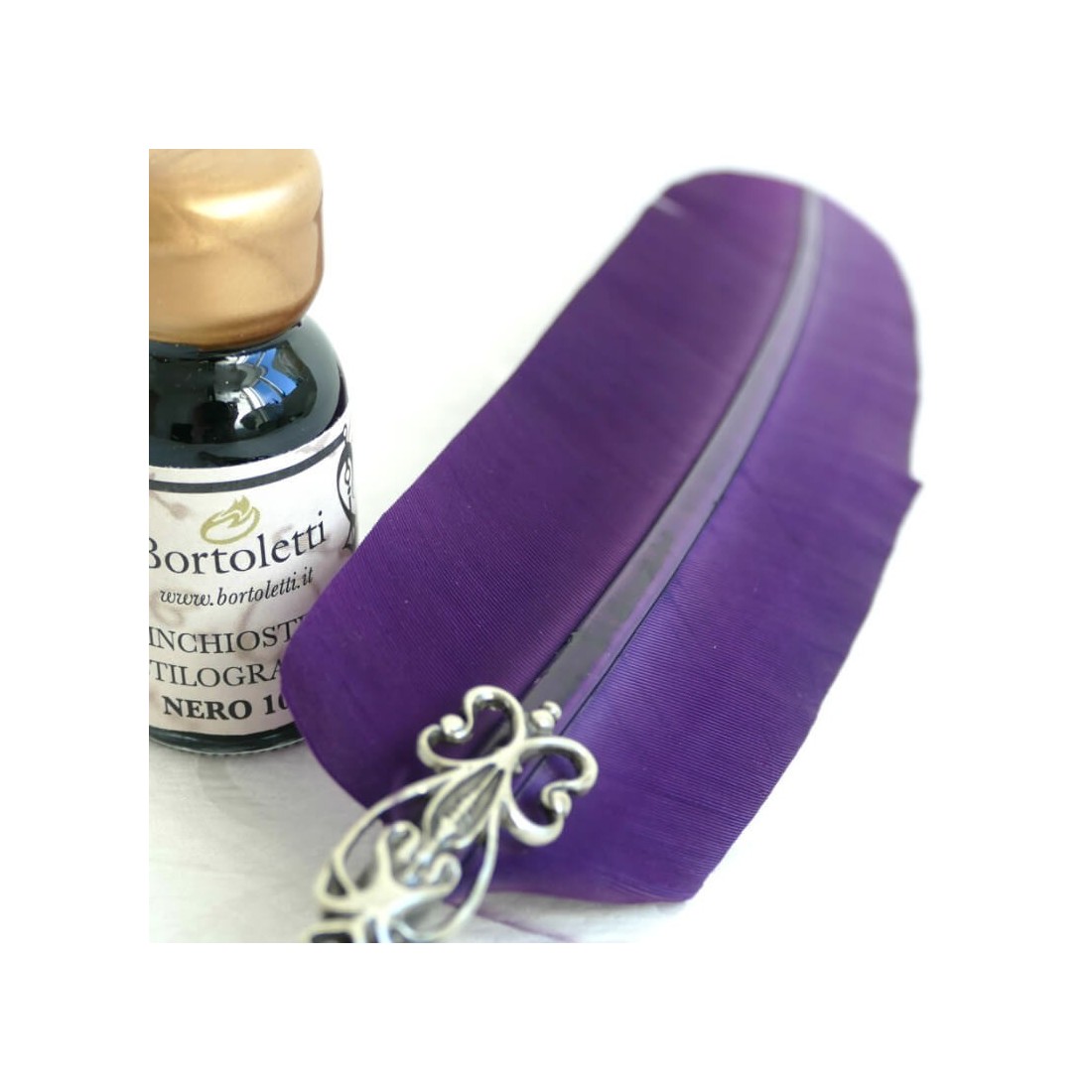 Feather calligraphy dip pen, two nibs and ink. This set comprises a goose feather calligraphy dip pen with bronze nib holder plated in nickel silver, a standard bottle of ink and two antique nibs. Manufactured in Italy by Bortoletti Fonderia Artistica.