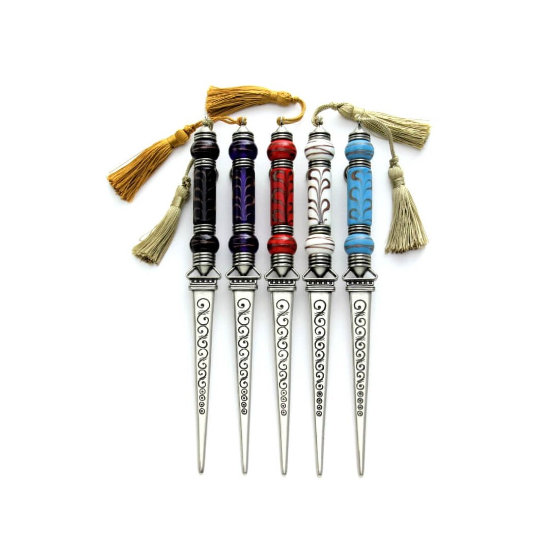 Letter openers TAG04 Bellucci. Handmade with flowered beads for an important gift. A letter opener with three Murano glass beads decorated with strands of aventurine fused into coloured glass. Aventurine is a mixture of glass and copper crystals that gives a shiny, metallic effect to the decorations, a unique process invented in the 1600s in Murano that distinguishes the beads in this beautiful set.