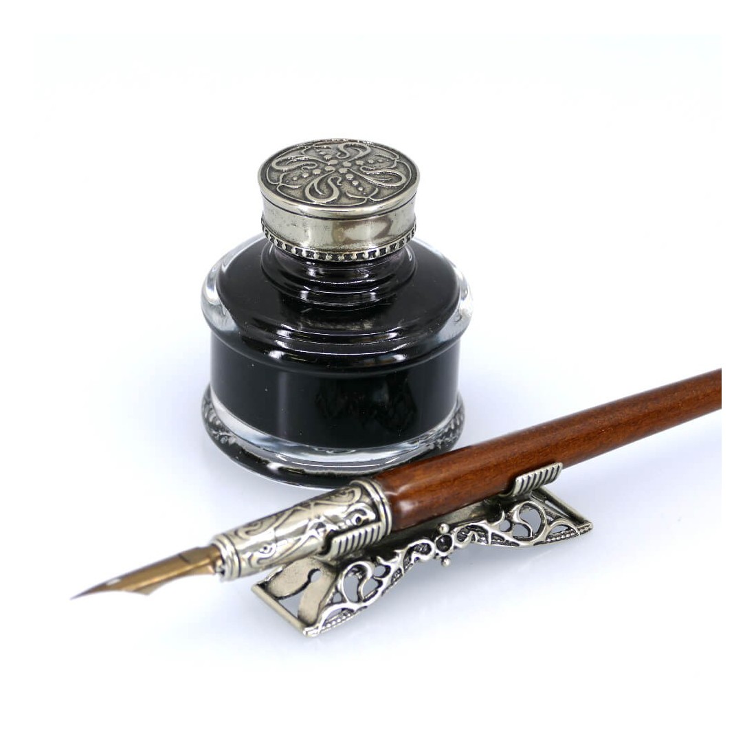 Great value! A terrific writing set comprising a wooden calligraphy dip pen, 40ml glass inkwell with black ink , bronze pen holder, blotter and three antique nibs.