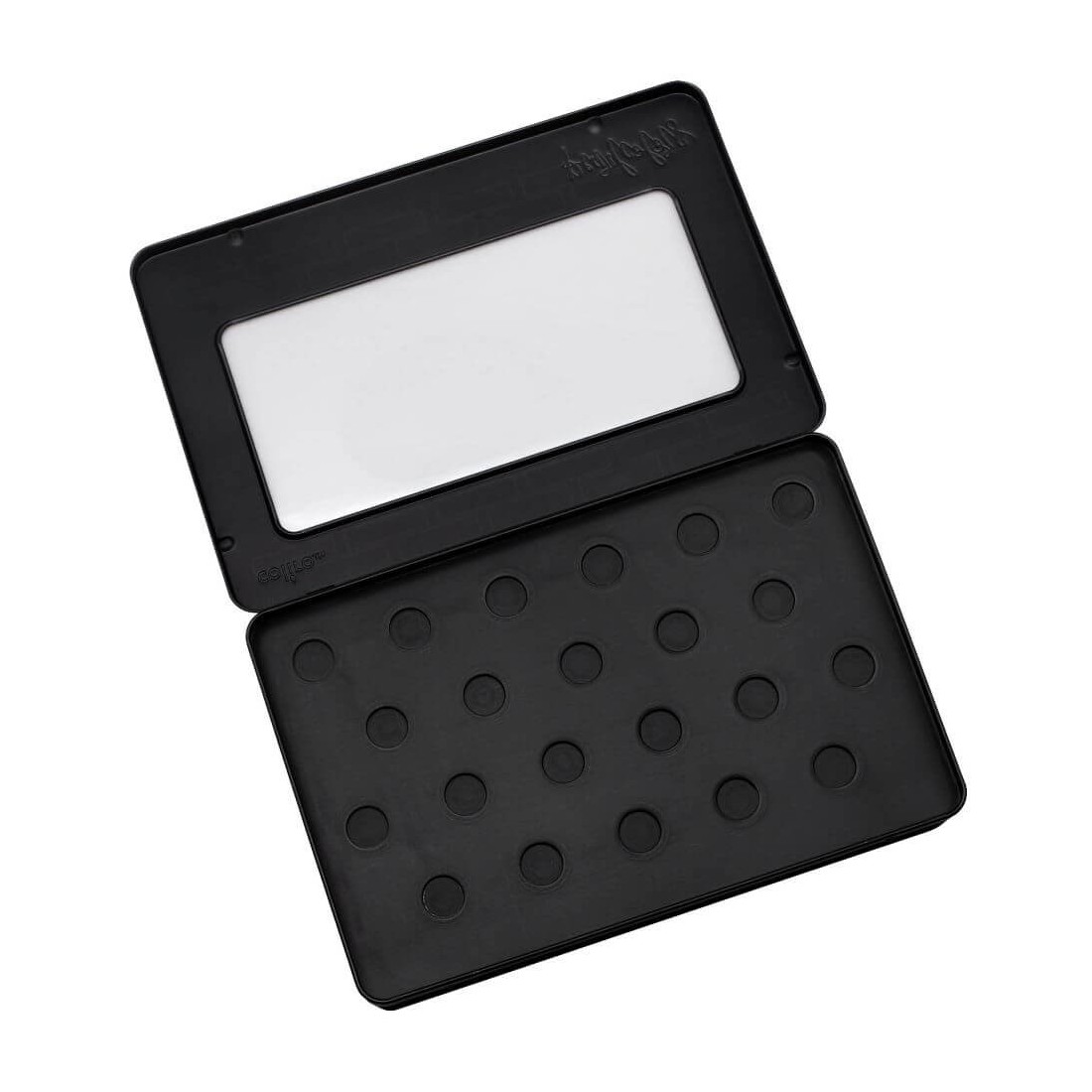 Amplia caja de paleta de metal negro para 22 Coliro Pearlcolors. Cuenta con una tapa clara y espacio para pegatinas de nombre, perfecto para organizar colecciones más grandes.