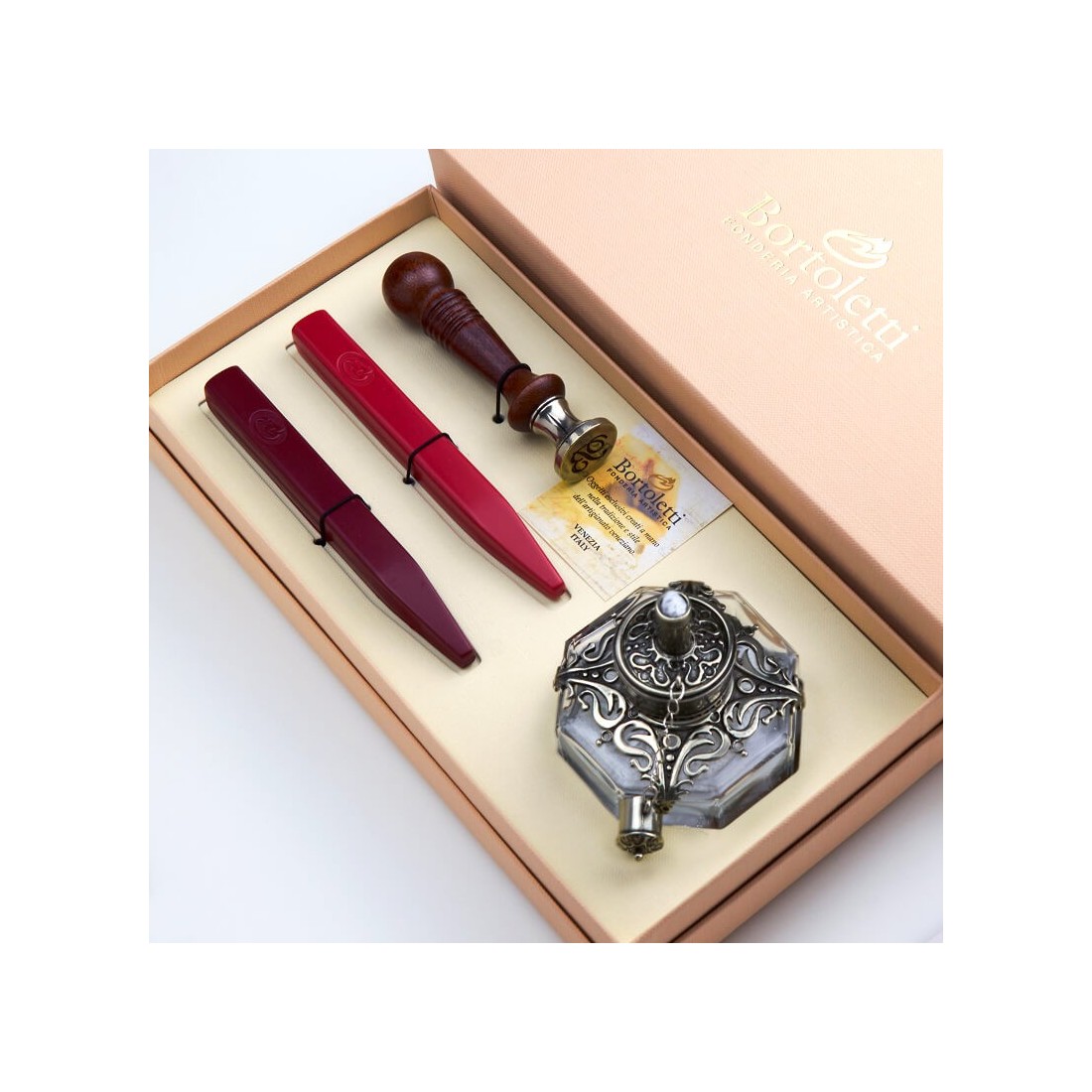 Elegante, confiable y bellamente hecho, este Bortoletti El conjunto de cera de sellado agrega distinción y encanto atemporal a cada sobre y recuerdo.