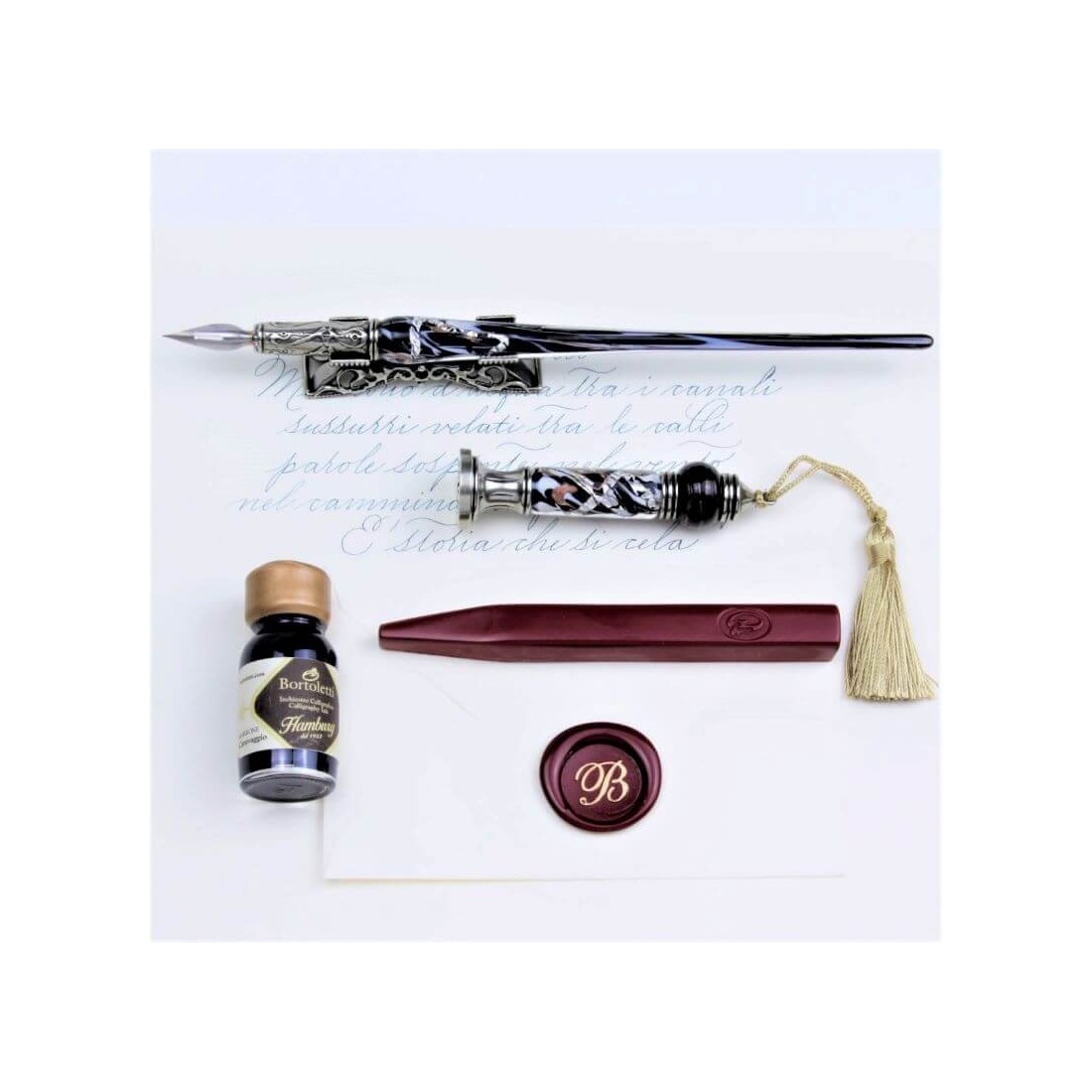 La Bortoletti Leopardi Pen and Seal Set es una elegante colección de caligrafía de cristales de Murano hechas a mano en Venecia. Con una pluma de cristal de Murano, un soporte de pluma de bronce plateado de níquel-plateado y un sello de cera intercambiable a juego, este conjunto refinado trae encanto veneciano atemporal a bodas, correspondencia y lujoso estilismo de escritorio.
