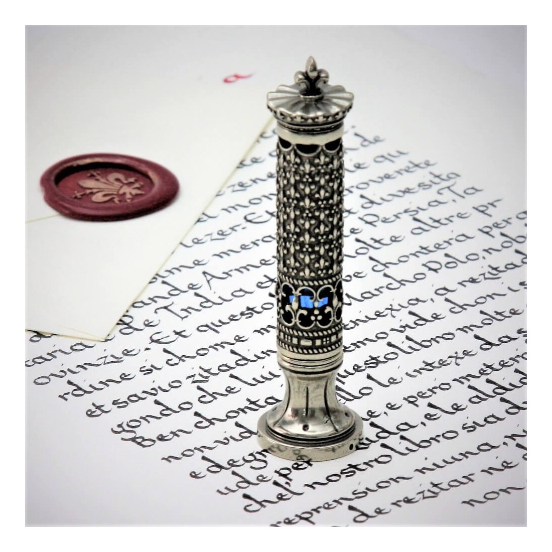 La Sello de cera de sellado de corona (SIG011) es una verdadera joya de diseño, hecha a mano en Venecia por los maestros artesanos en Bortoletti. Creado utilizando el método de fundición de cera perdida tradicional, el cuerpo de bronce se termina con un elegante chapado de níquel-plata y detallando a mano, dándole la apariencia y el refinamiento de joyas finas.