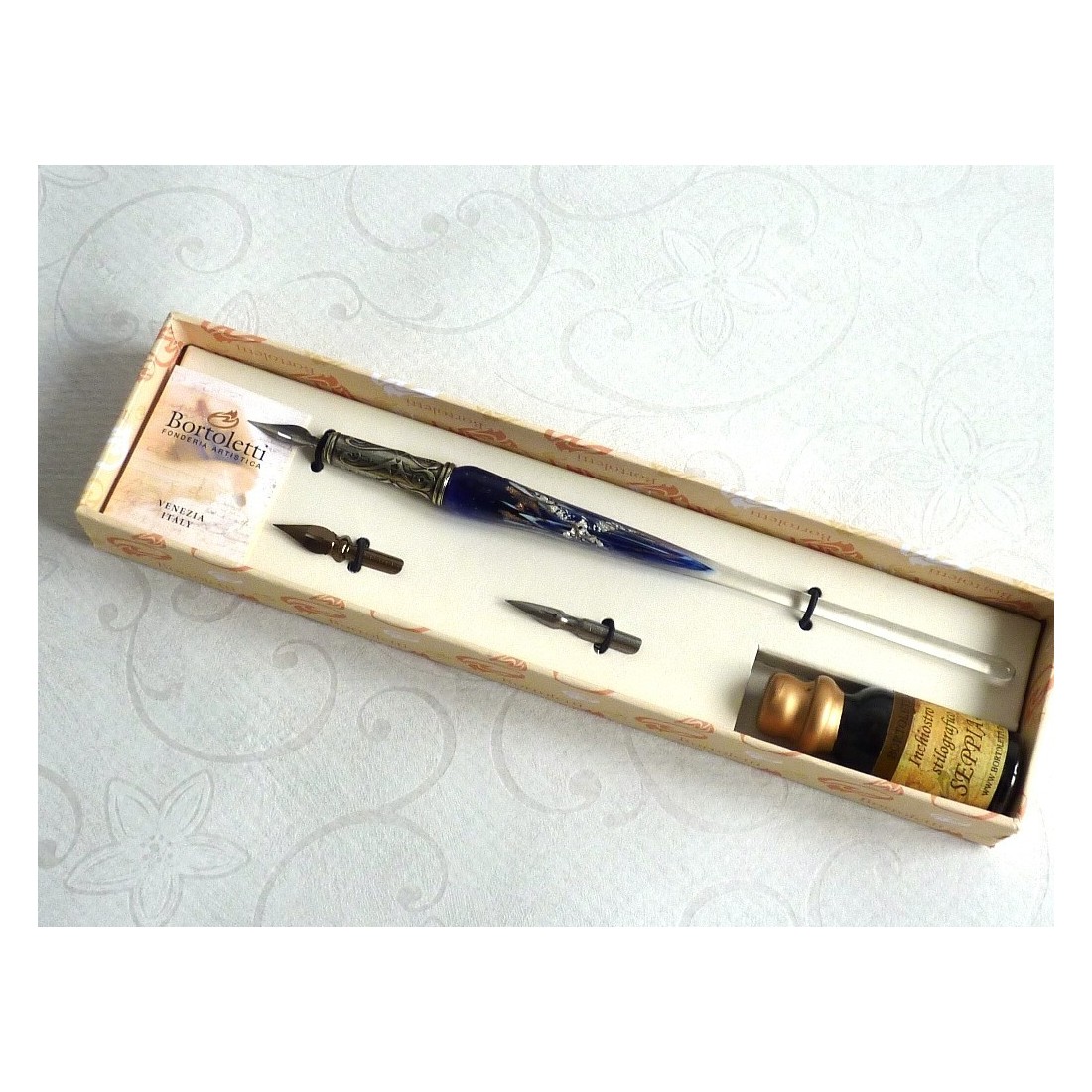 Un maravillosamente hecho a mano, acabado a mano, juego de plumilla de caligrafía, que comprende una pluma de cristal de Murano con las escamas de la hoja de plata, tres puntas y una botella de tinta. Disponible en una gama de colores maravillosos.
