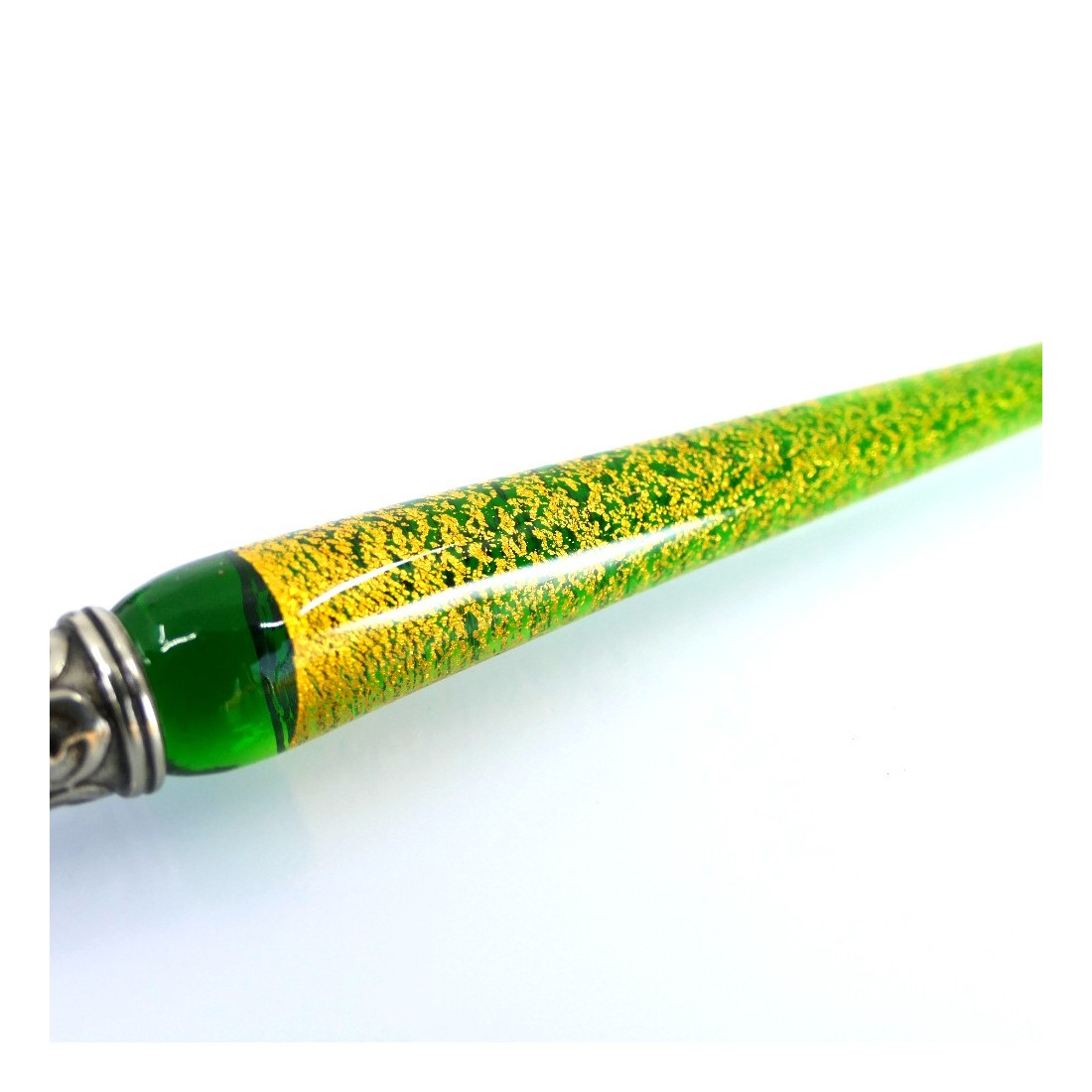 Glass plumilla de caligrafía que comprende Murano pluma de vidrio con pan de oro, tintero de cristal con adornos de bronce, sostenedor de la pluma y papel secante. La claridad de la pluma de cristal está adornada con hojas de oro. Durante los descansos se puede colocar en el sostenedor de la pluma, y mejorar su escritura con el papel secante. Diseño italiano original.