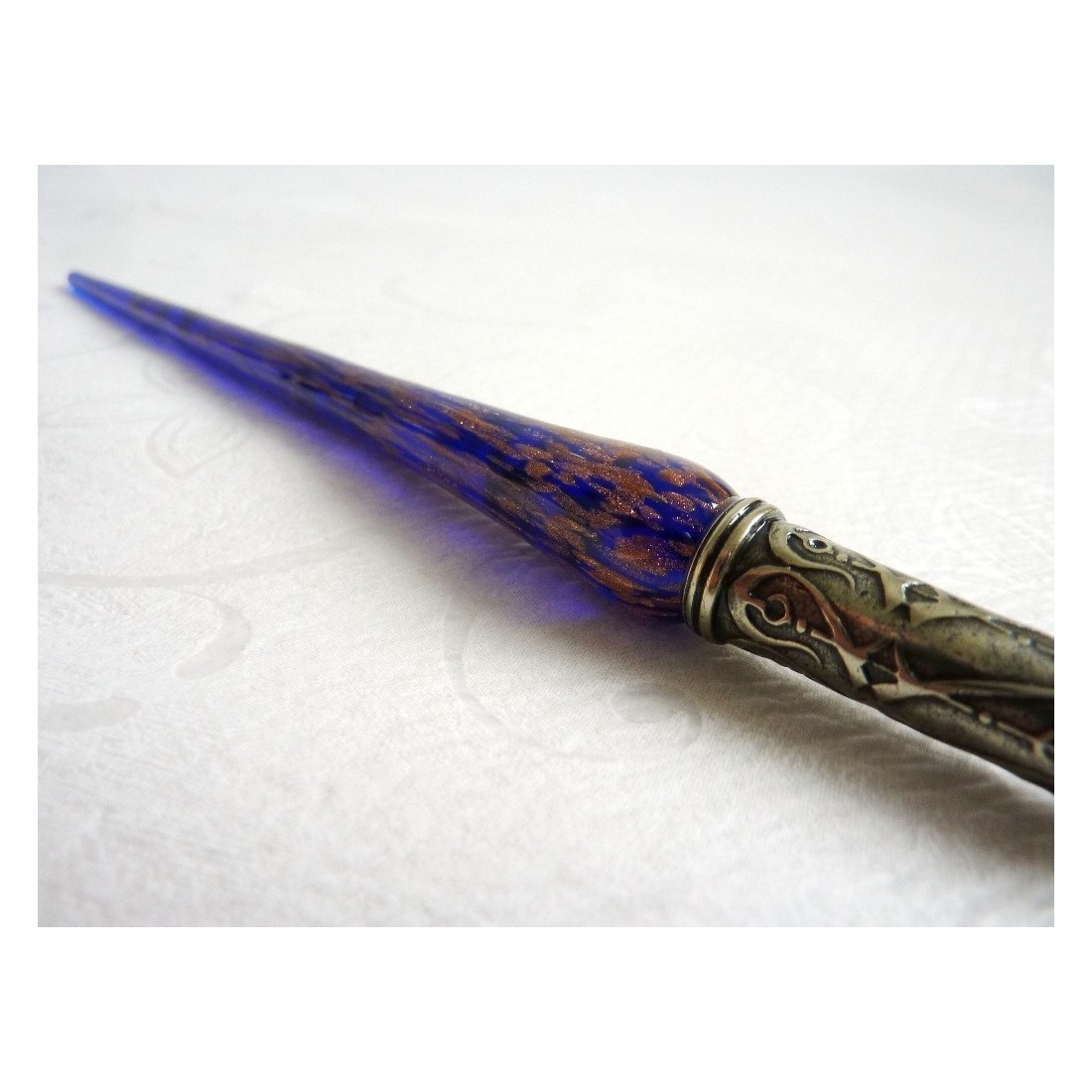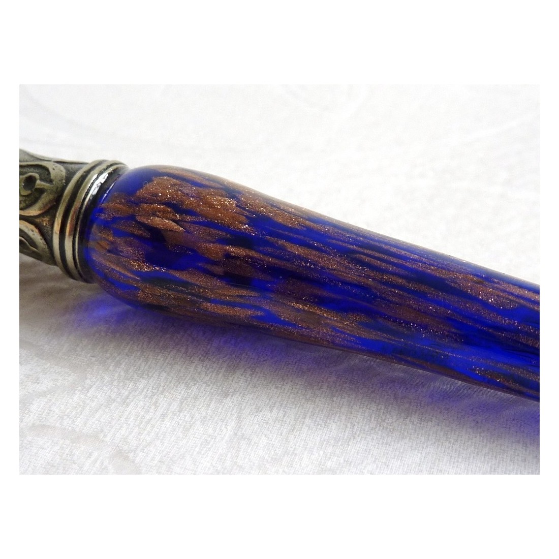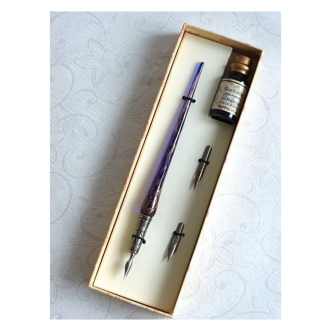 Juego de bolígrafos de cristal y cristales de cobre. Un juego de bolígrafos de inmersión de caligrafía bellamente elaborado y acabado a mano, que comprende un bolígrafo de cristal de cuarzo de aventurina de Murano incrustado con cristales de cobre. También se incluyen tres puntas y una botella de tinta. Disponible en una gama de maravillosos colores.