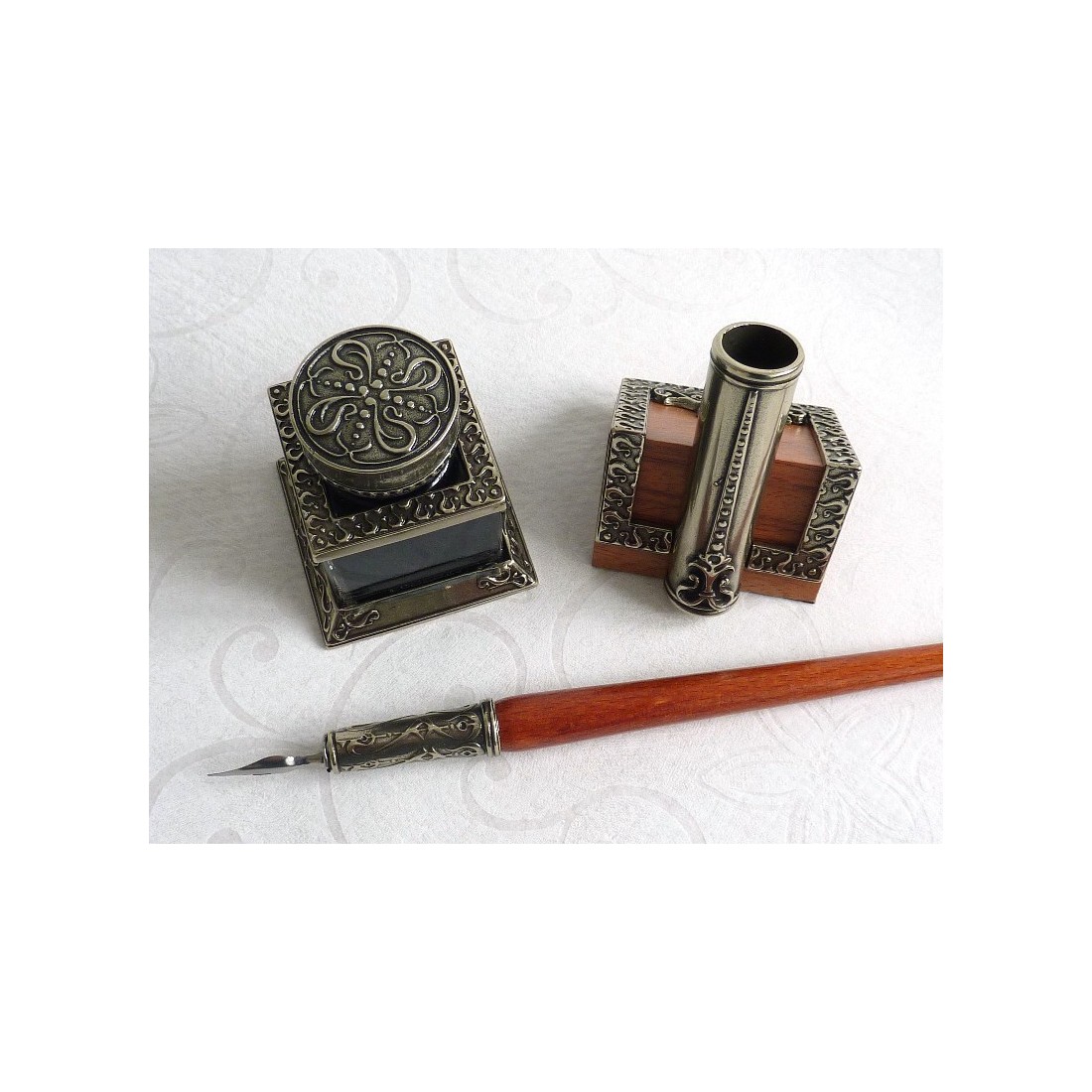 Pluma de caligrafía de madera, tintero y portaplumas
