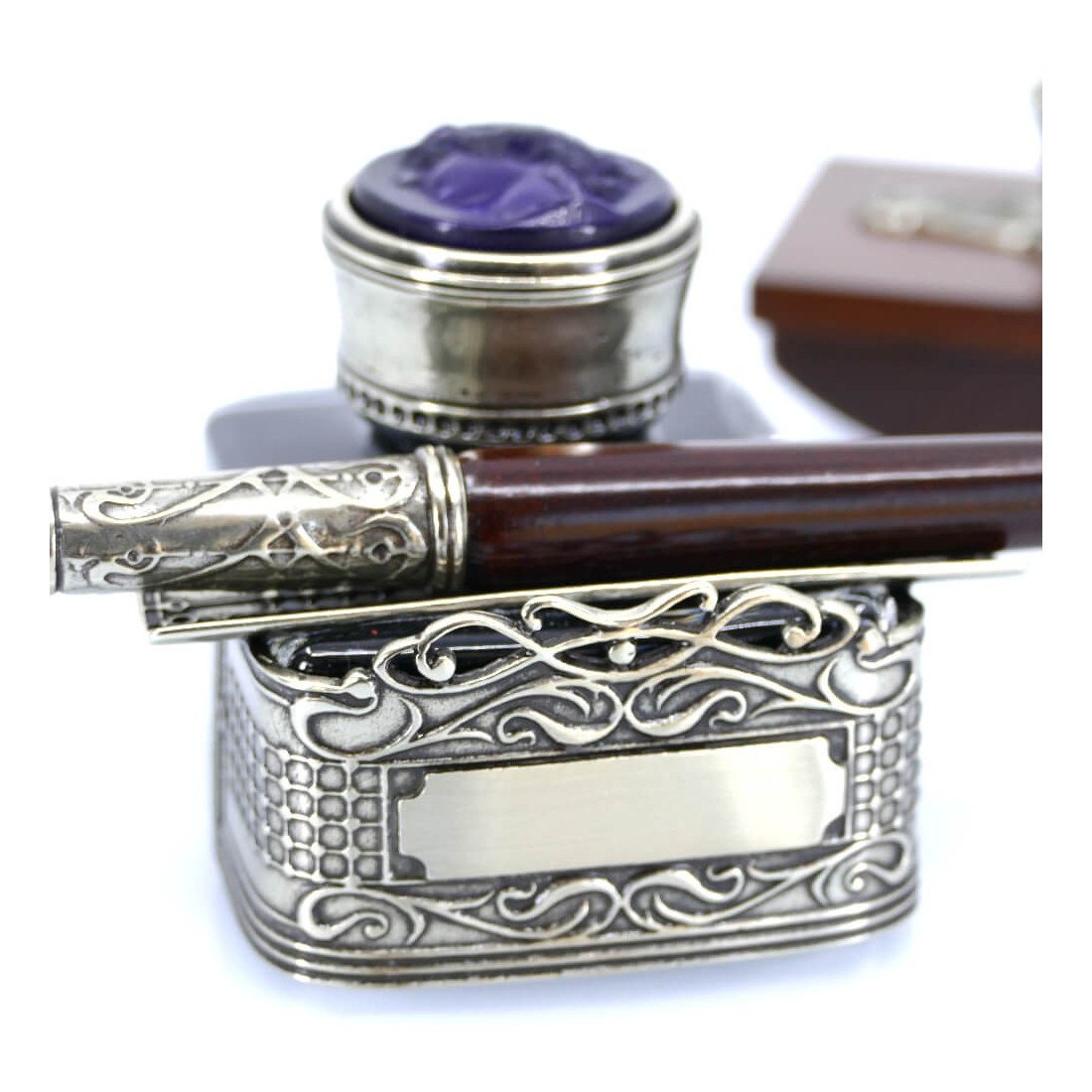 La calidad rezuma con este magnífico juego de rotuladores de caligrafía, que consta de un rotulador de caligrafía de madera, un tintero de vidrio con una tapa de camafeo de vidrio con un portalápices de bronce integrado. Este set también tiene un secante de tinta para secar y mejorar tu escritura.