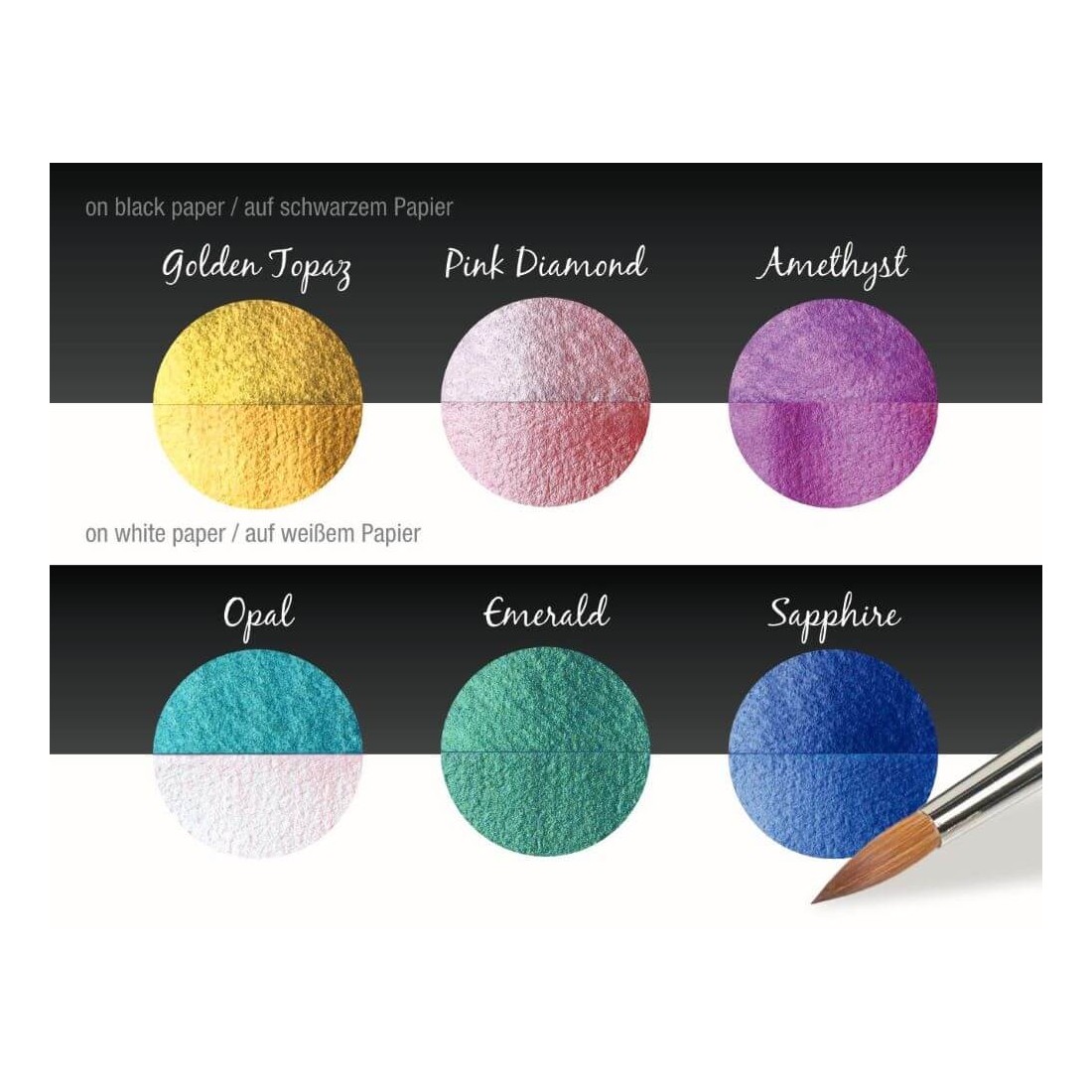 Valmistettu kiille, luonnon mineraali, joka tarjoaa laajan valikoiman metallinhohtosävyt, kulta ja hopea värikkäiden, loistava helmi värejä. Aktivoi hieman vettä paletti ja sovelletaan NIB harjalla. Noudatetaan kaikkia vaimennuspinta, kuten paperi, puu, kipsi, jne.