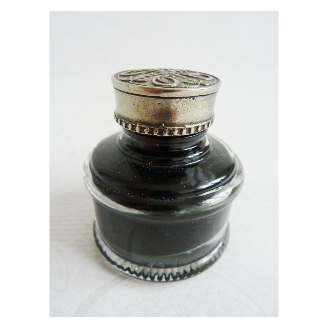 Tyylikäs lasi mustepullo kanssa nikkeli hopea tulppa. Sikisi Bortoletti päällikön koru, tämä ihana mustepullo tekee kaunis lisä kirjoituspöytä tai kalligrafiaa asetettu.