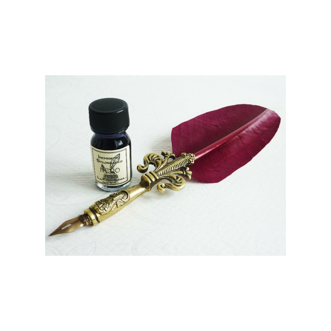 Keskiaikaiset kynät olivat tyypillisesti höyheniä, joissa oli piikki, joka oli leikattu akselista kynän luomiseksi. Fleur D'Lysin höyhenpenä, joka on valmistettu käsityöstä Italiassa aidoista hanhen höyhenistä, on todellinen tunnusmerkki, jossa huomiota kiinnitetään yksityiskohtiin. Laatikko on pakattu huippuluokan lahjakassiin, jossa on näkökone, ja se on ihanteellinen lahja kalligrafian ja taiteen ystäville.