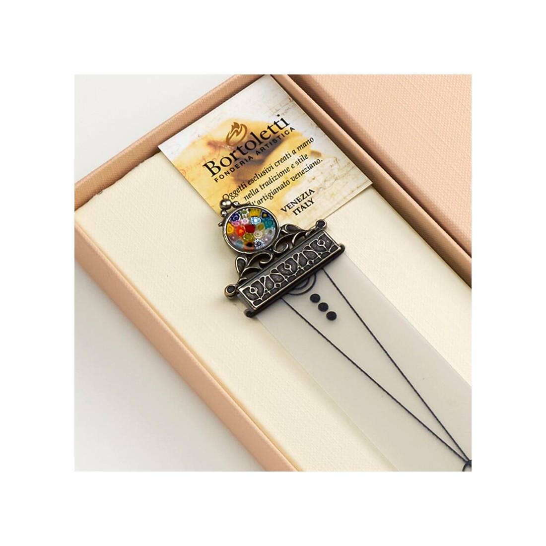 Käsintehty Murrina-kirjanmerkki valkoisella pronssisella friisillä, jossa on lasimurrina. Venetsialainen Millefiori murrina on peräisin erilaisista geometrisista ja kukka-aiheista, jotka ovat lumoavasti muotoiltuja pieniä lasitankoja, jotka ovat edelleen mysteeri monille ihmisille hienon koristelunsa vuoksi.