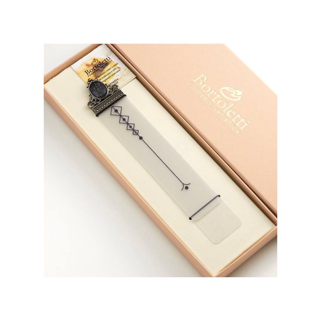 Käsintehty kirjanmerkki tyylikkäälle yleisölle, joka on tulosta Bortolettin ja hänen korumestarinsa jatkuvasta suunnittelun alan tutkimuksesta. Lasitahnan käsittely on ainutlaatuista, ja se on siirtynyt Muranon lasinvalmistajien sukupolville.