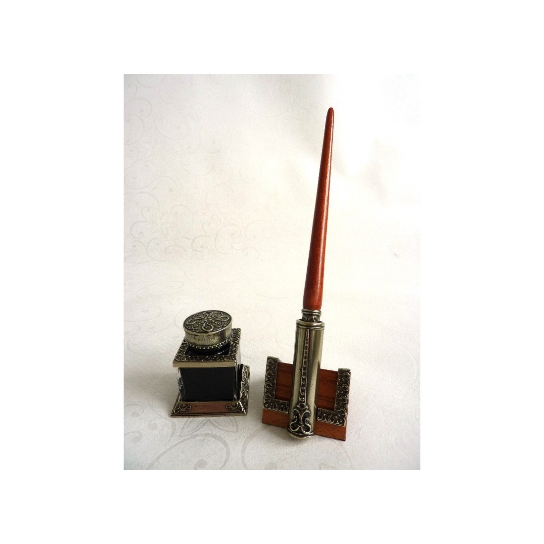Puinen Dip kynä, Inkwell & Penpiter. Tämä sarja käsittää puisen kynän, jossa on pronssi nib-pidike nikkeli hopea ja muste. Nimle Silver Sisustus rikastuttaa puinen kynä, muste ja kynäpidike. Valmistettu Italiassa Bortoletti Fonderia Artistica.
