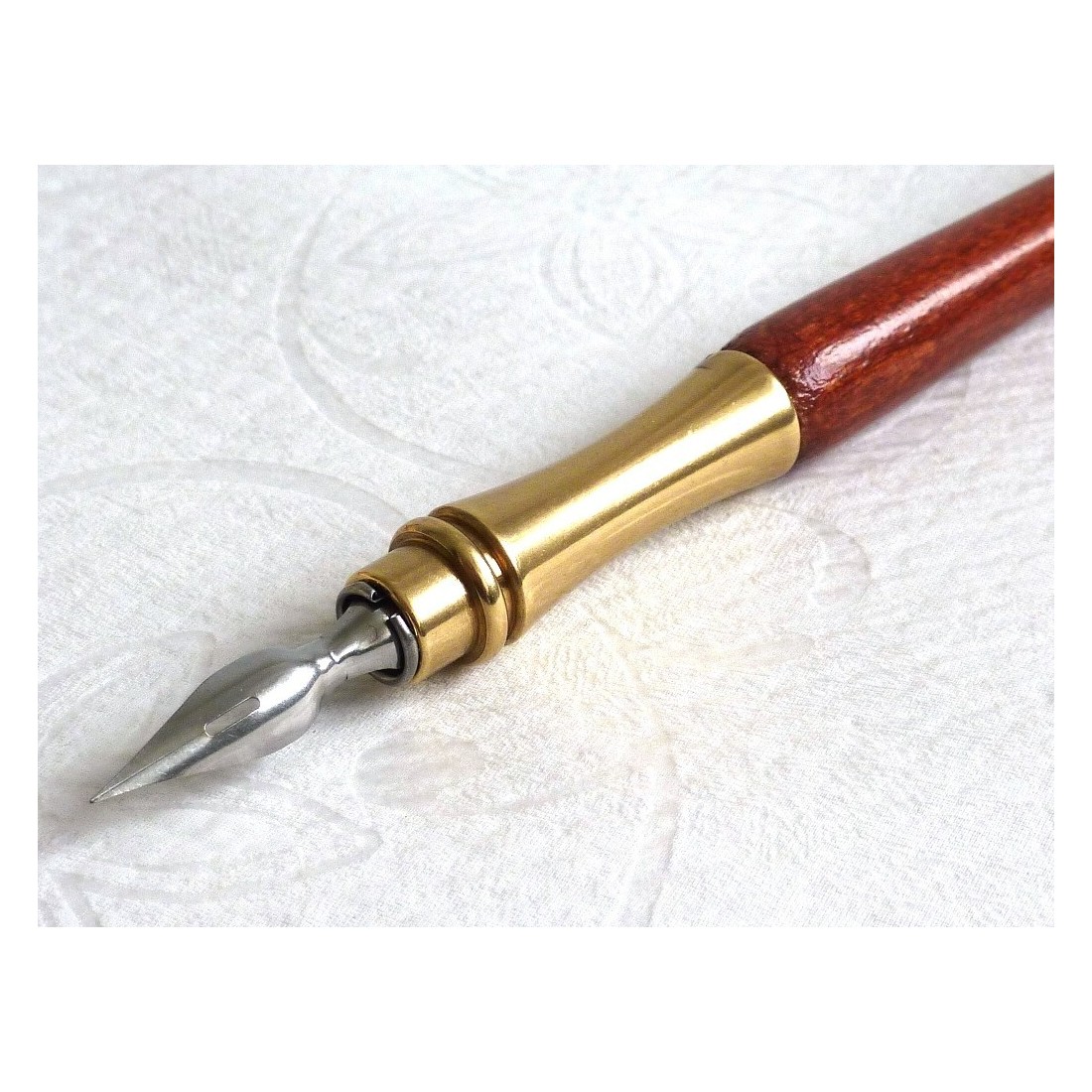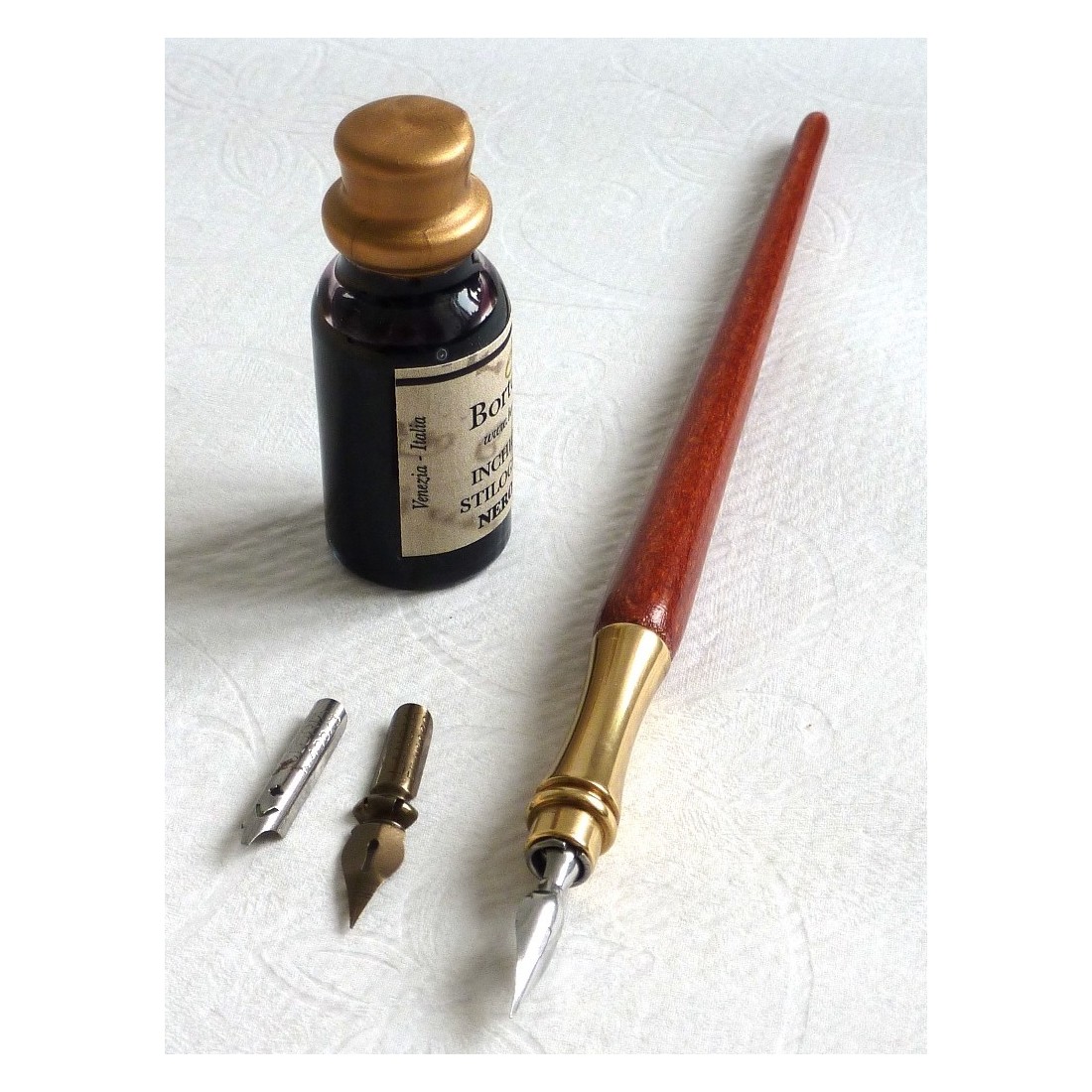 Puinen kynä, jossa messinki nibin haltija. Suuri arvo ja tyylikäs hienostuneisuus. Tämä upea sarja käsittää puuta ja messinkiä kalligrafia dip kynä, 10 ml: n pullo mustetta ja kolme antiikki nbs.