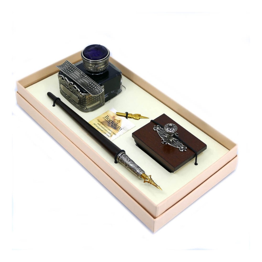 Laatu huokuu tällä upealla kalligrafiakynäsarjalla, joka sisältää puisen kalligrafiakynän, lasisen mustesäiliön, lasikuvikannen ja integroidun pronssikynänpidikkeen. Tässä sarjassa on myös mustepuhdistin, joka kuivaa ja parantaa kirjoittamista. Kaiverrettava. Valmistanut Italiassa Bortoletti.