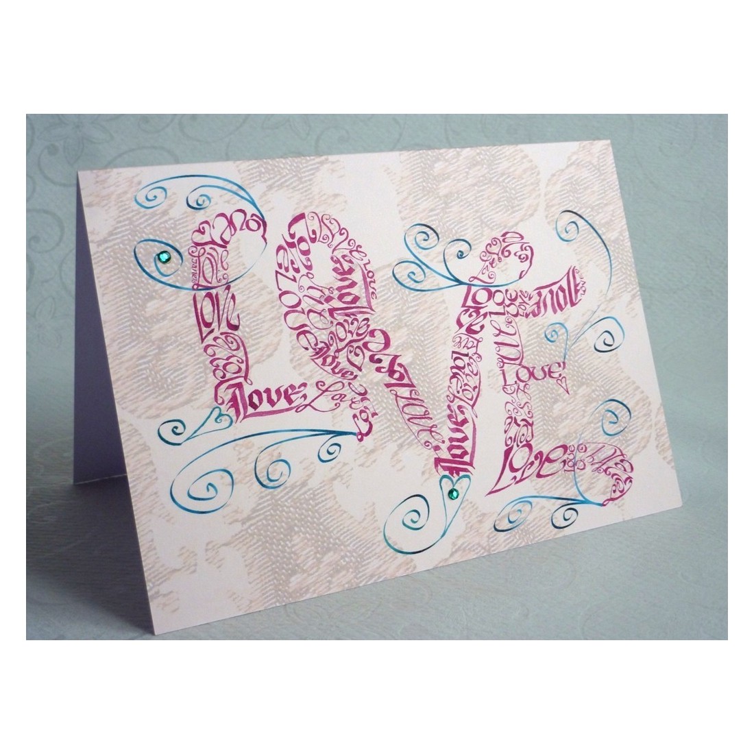 Klassinen versio toisesta todellisesta kalligrafiakortistamme. Tyylikäs punainen kirjain muodostaa sanan "rakkaus", jota ympäröivät virtaavat pyörteet, ympyrät ja halkaisijat.