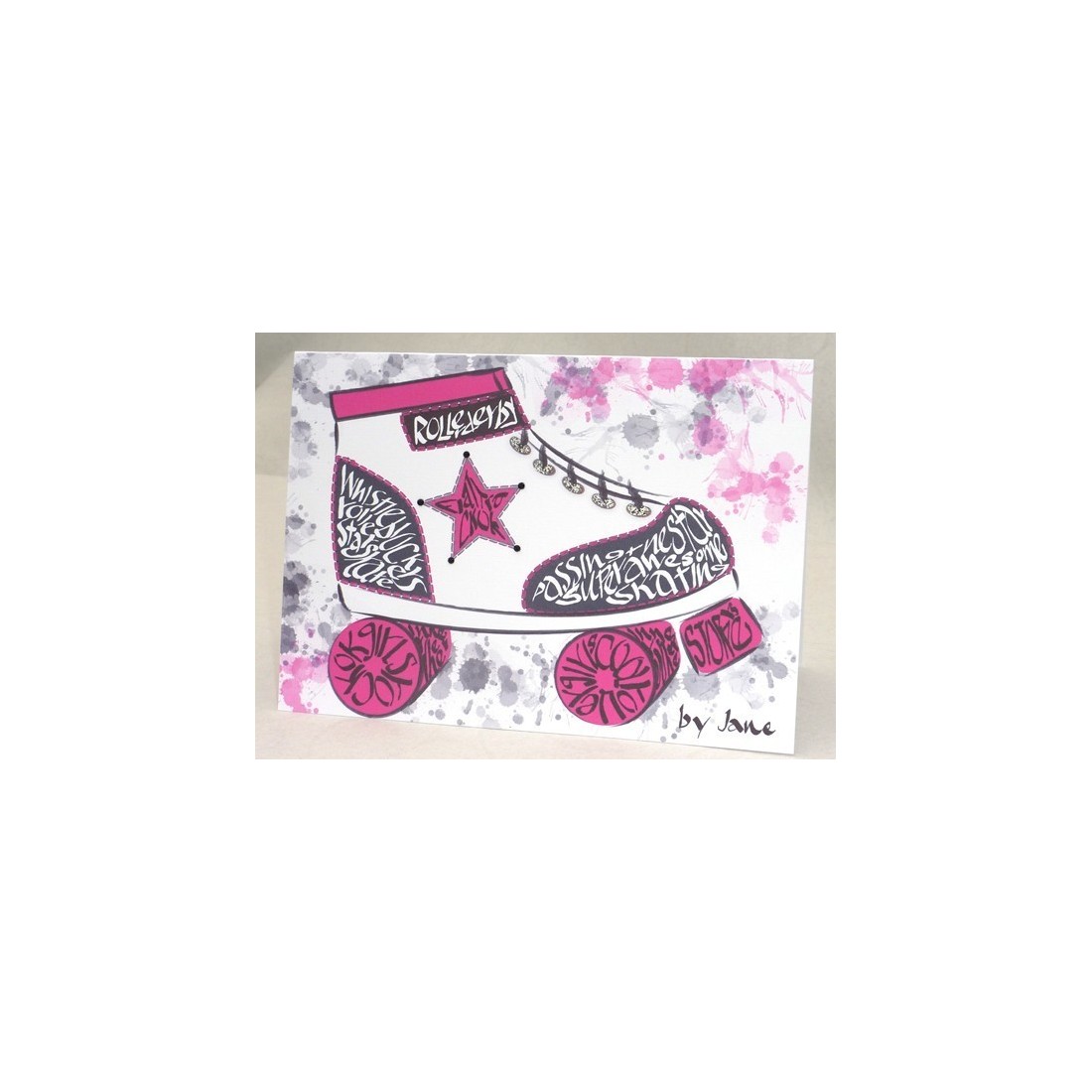 Ainutlaatuinen käsin viimeistelty rullaluistelukortti. Suunniteltu käyttämällä kalligrafiaa sanoissa ja lauseissa, jotka heijastavat rullan derbi-kohtausta. Tähden ympärillä olevat silmukat ja halkaisijat tekevät tästä upeasta kortista kimalluksen. Saatavana vaaleanpunaisina tai punaisina.